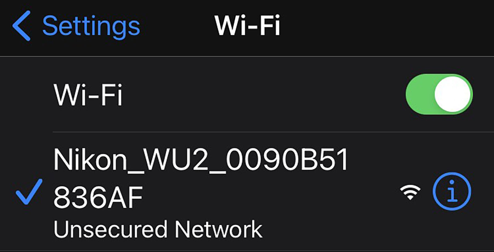 I activated the Wi-Fi in my D750’s Setup Menu. After that, using my iPhone, I searched for the Wi-Fi signal and selected that.