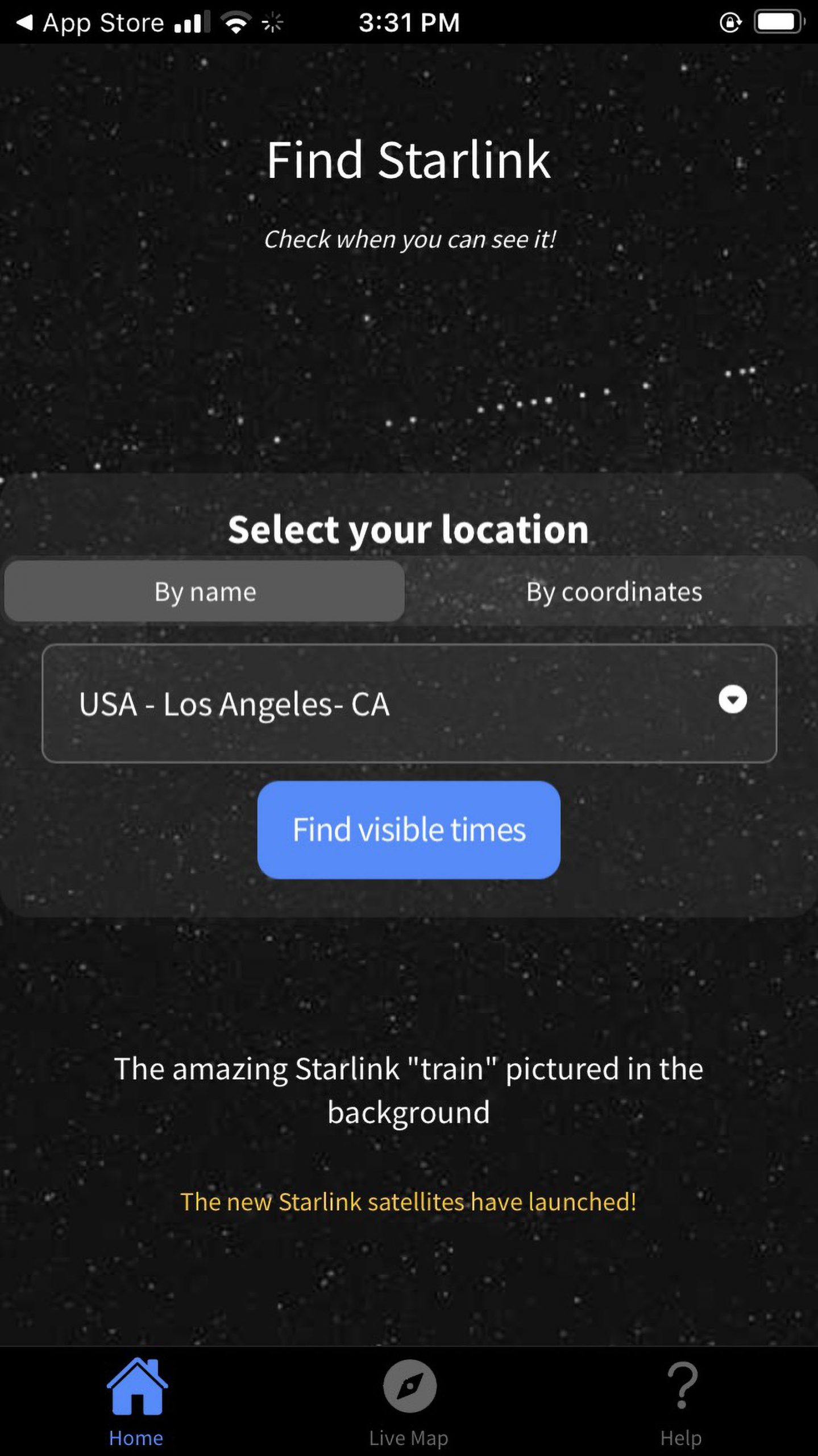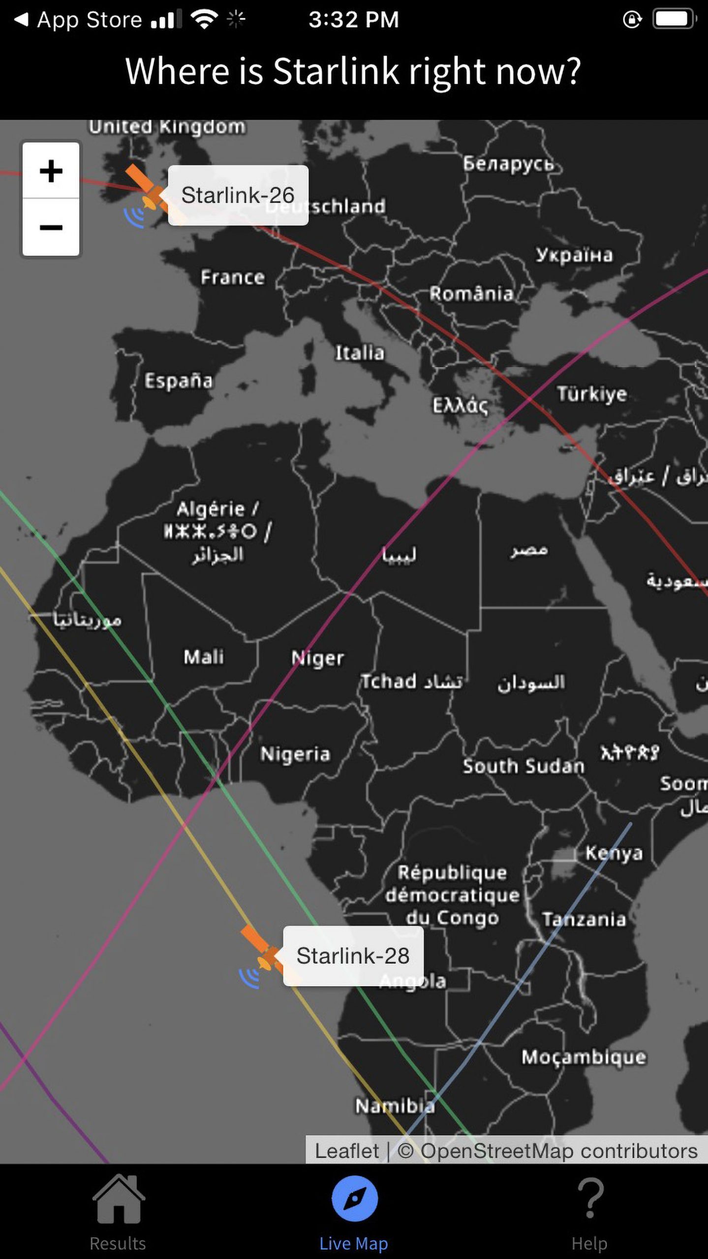 Clicking on Live Map at the bottom of the screen produces a map that shows the flight paths of the Starlink satellites. Zoom in or out as you please.