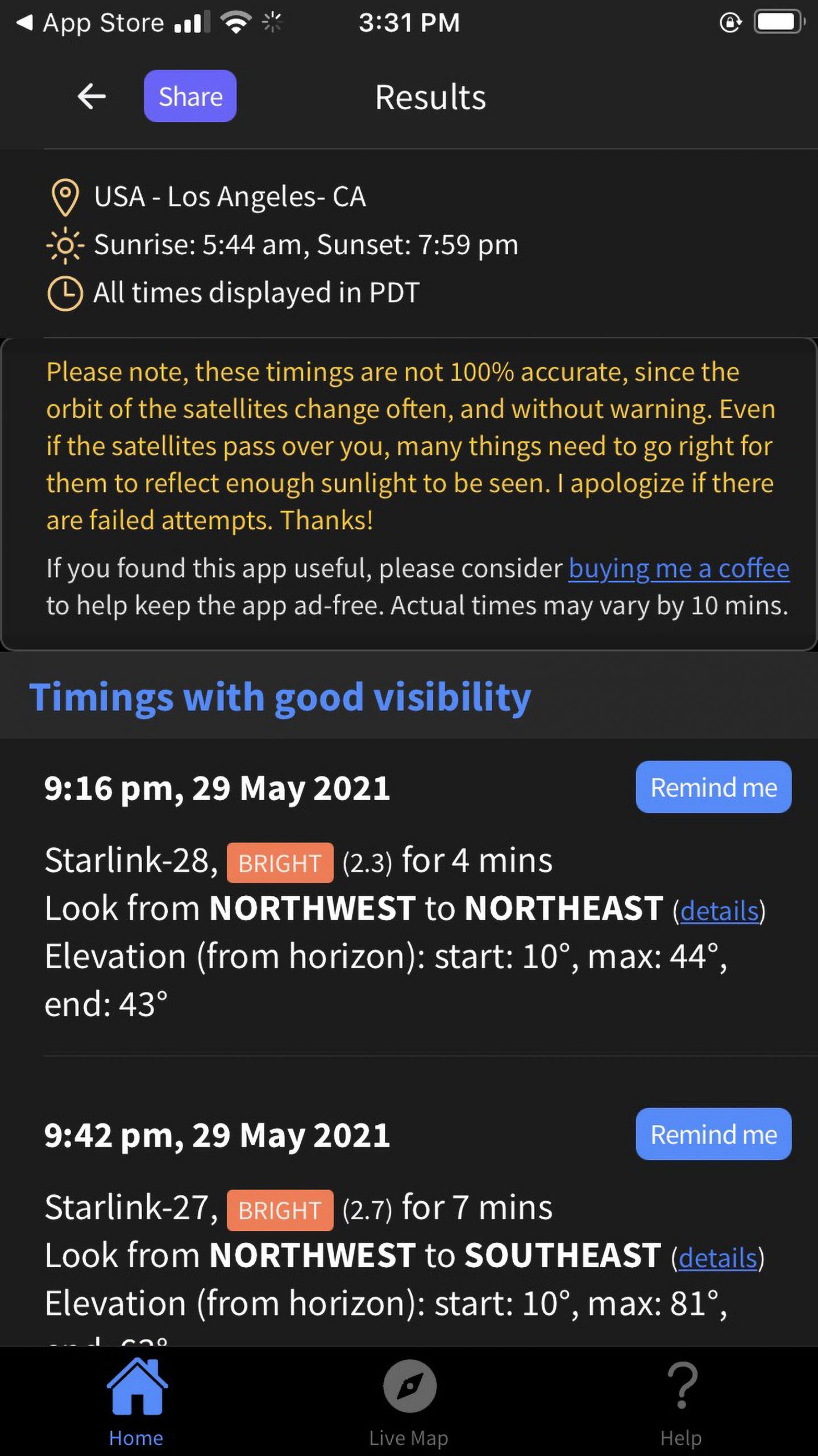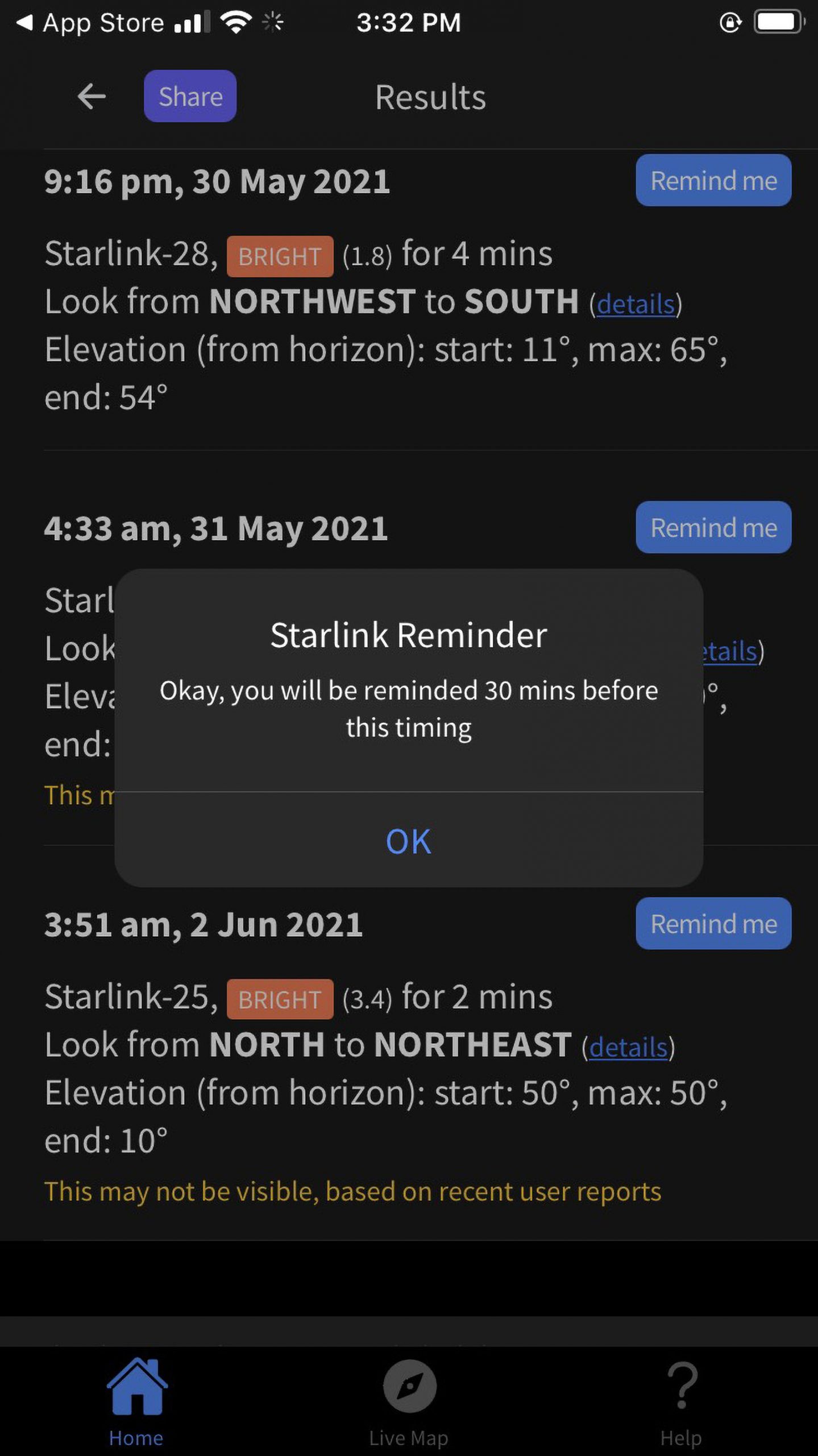 Get a reminder just before Starlink is visible