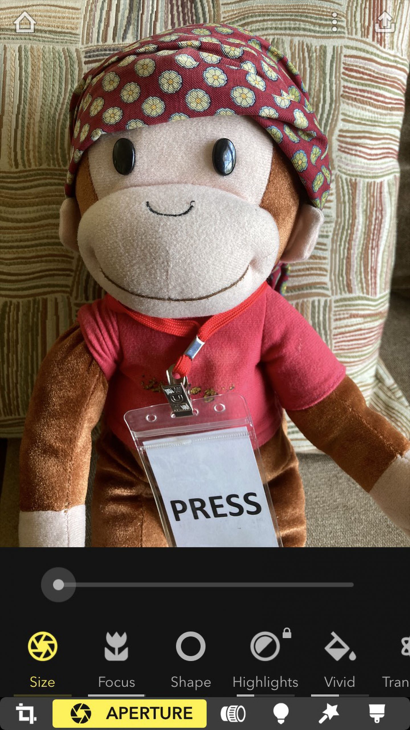 I took a photo of George the monkey using the Focos app. This is where it gets cool. Focos allows you to control the point of focus … after you take the photo. It’s rather easy as well. Simply take a photo using the Focos app. Then use the aperture and focus sliders!