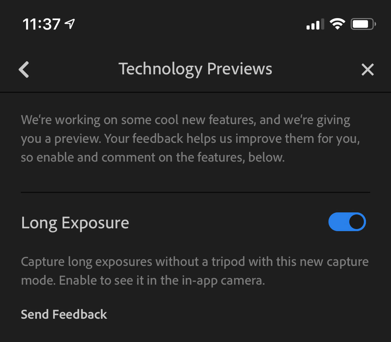 Available as a technology preview for iOS users, you can use the Lightroom mobile app to capture a long exposure up to five seconds. It’s great for some creativity outdoors or around the house, and the results are stellar! To turn on this technology preview, click the gear icon in the upper right corner, and click “Technology Previews.”