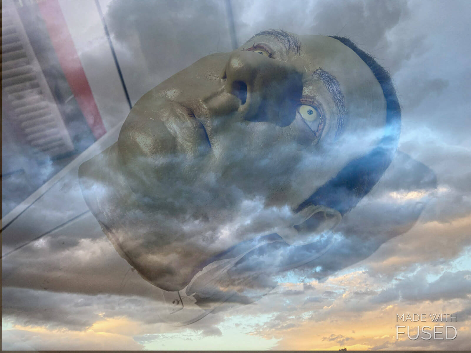 I first decided to blend two photos. The first is of the head of Data from “Star Trek” from an exhibit at Skirball Cultural Center in Los Angeles. The second was a photo of the beautiful clouds earlier that day.