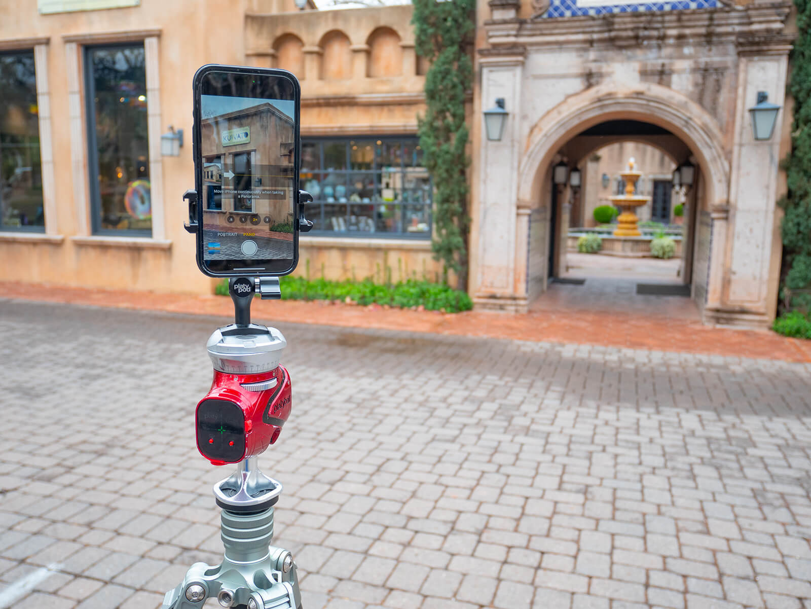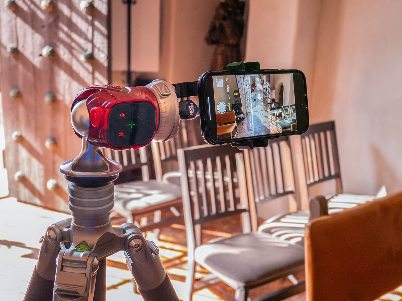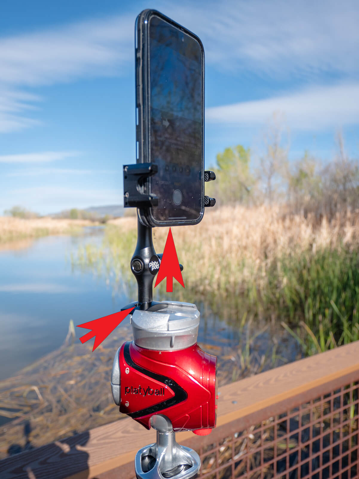 I’ve always shared that when creating panoramic images, you achieve better results when you are pivoting around the sensor of the camera vs around the lens or having the camera held out in front of you. You can see an article here on that for your main camera photography. Platyball Elite has a built-in level between the camera and the tripod. Once that is level, your camera will move level from one side to the other with the also built in rotator. This makes it easy to set up the iPhone camera to follow the pano line exactly. When mounting the iPhone I offset it so the camera was in the center of the pivot point.