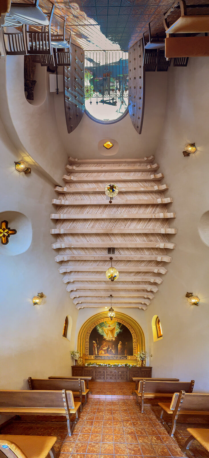 Panorama images can be made in the vertical orientation as well, AKA vertorama. Once you have your camera mounted, just flip the Elite on the side. Activate and utilize the level and you are in business for a vertorama. Larry wanted me to show a vertorama extreme. To create photograph from in front through overhead to behind. This set up worked for that as well. I made one vertorama inside the intimate small chapel. Another created outdoors in the courtyard featuring a fountain and the wonderful architecture and arch on display.