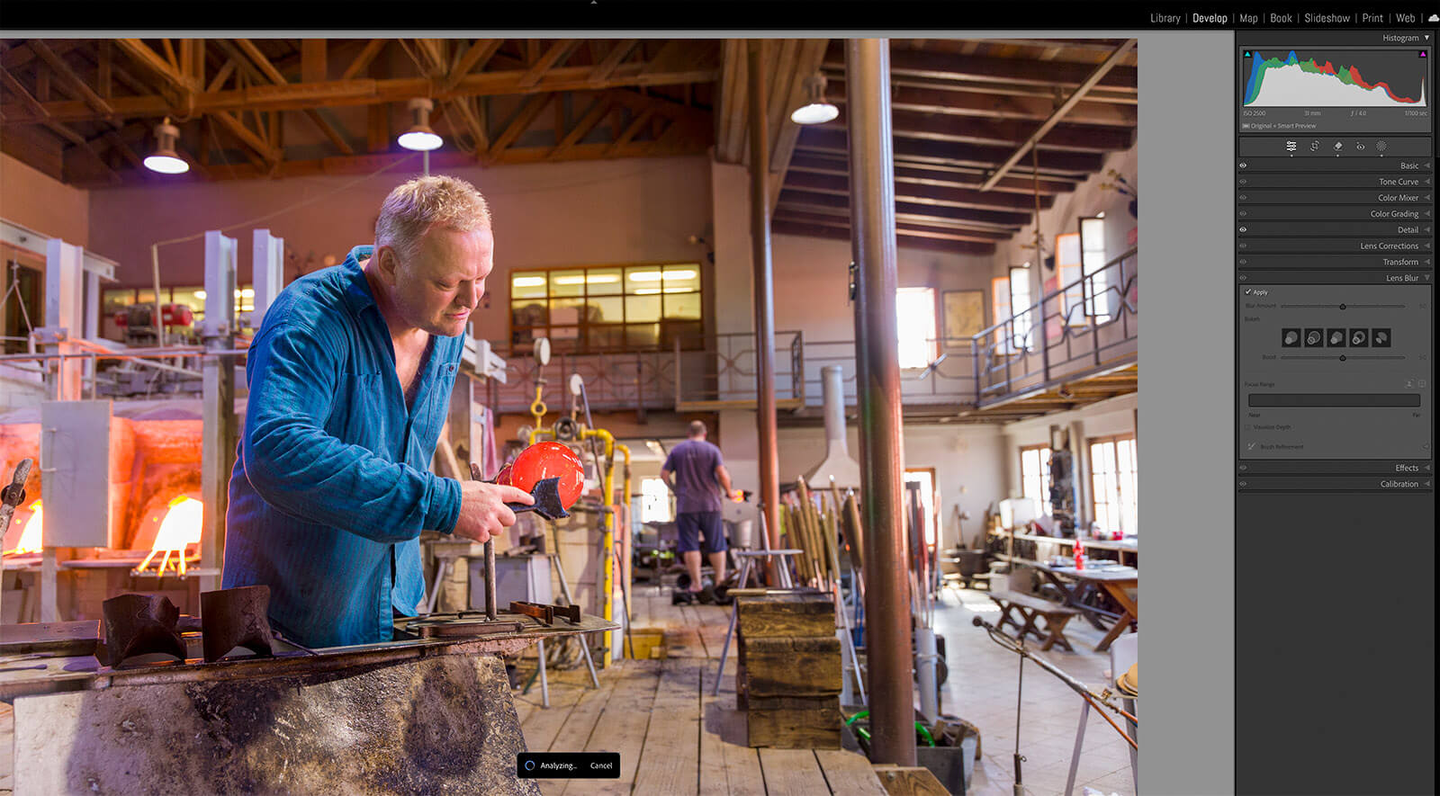 Adding extra blur to the background distinguishes the glass blower from the rest of the scene. Tip: Mask the background and darken it slightly. Blurring can make the background look brighter.