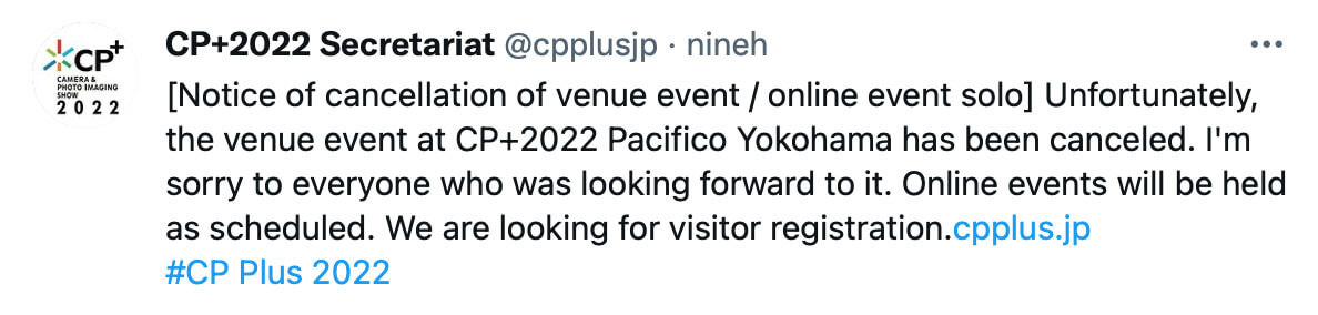 Overnight, CP+ announced that it has canceled the on-site portion of its event, citing the ongoing COVID-19 pandemic. The event, which was slated to be held Feb. 24-27, will now be held exclusively online, with previously scheduled online events happening as planned.