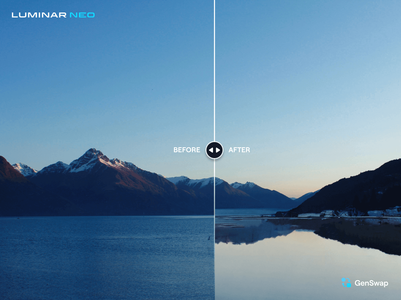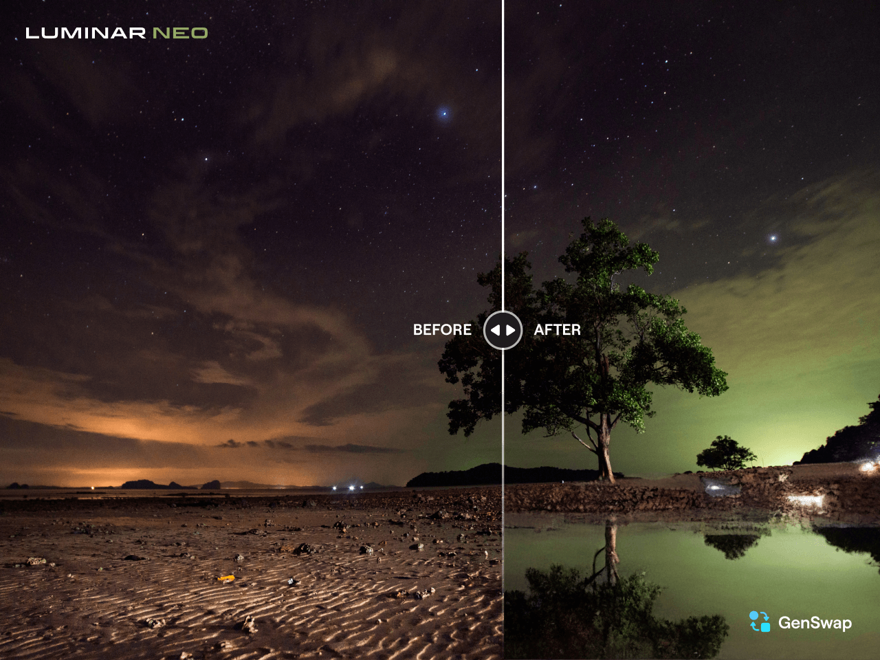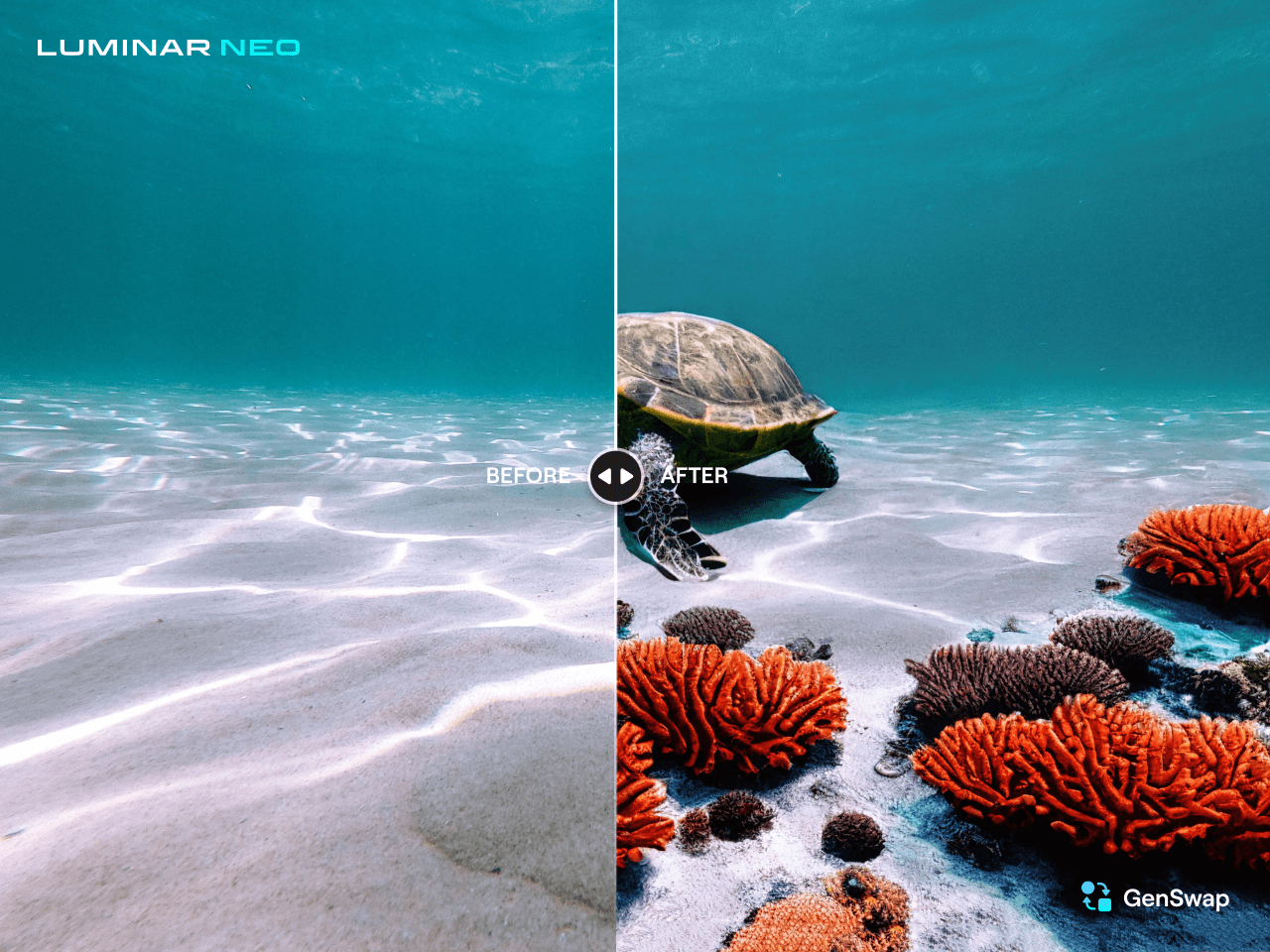 - GenSwap: This technology allows photographers to change the image composition by replacing or swapping objects or seamlessly adding new details generated by AI according to the user’s prompt. GenSwap allows you to also enhance images by adding elements such as trees, animals, and more, transforming your photos into mesmerizing visuals. For example, change an unpleasant tree for a better looking one, add a bird to the sky, or drop a stone in the desert to make the photo complete.