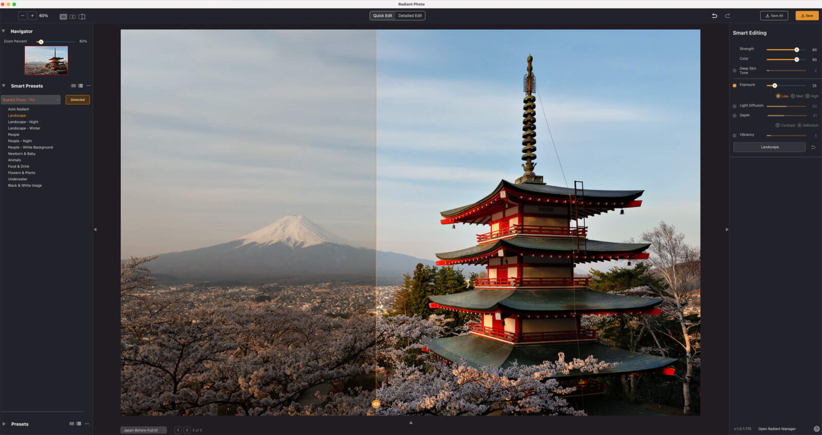 Radiant Photo processes images with the Perfectly Clear Engine. This trusted technology is the world’s leading intelligent image correction with 140+ million images processed every day! We the same superior quality image processing core trusted by the majority of professional photo printing labs worldwide. Radiant Photo builds upon this solid foundation with unique LOOKs, Smart Presets, and new technology found nowhere else.