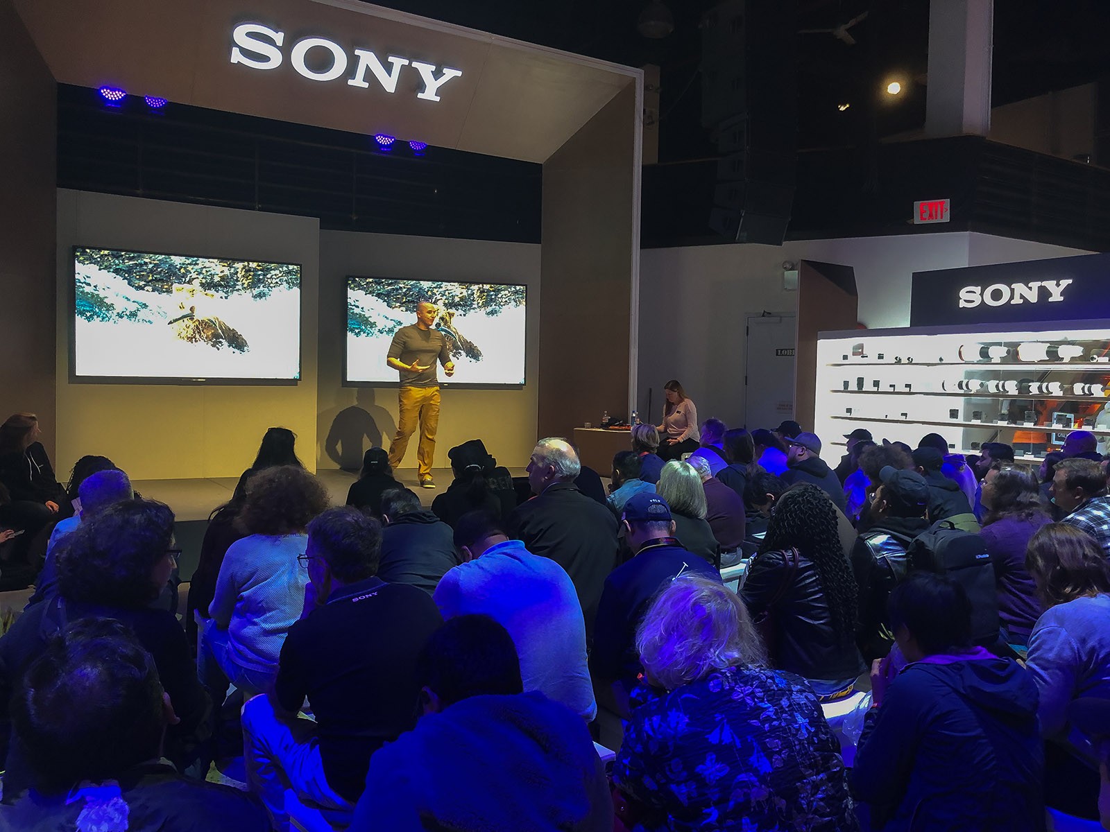 Sony had its visionaries presenting photographic education and inspiration on a stage opposite the sets. A seating area was provided. The presentation by wildlife photographer Colby Brown that I saw was standing room only. Nineteen speakers presented and there were over 30 presentations and photowalks.