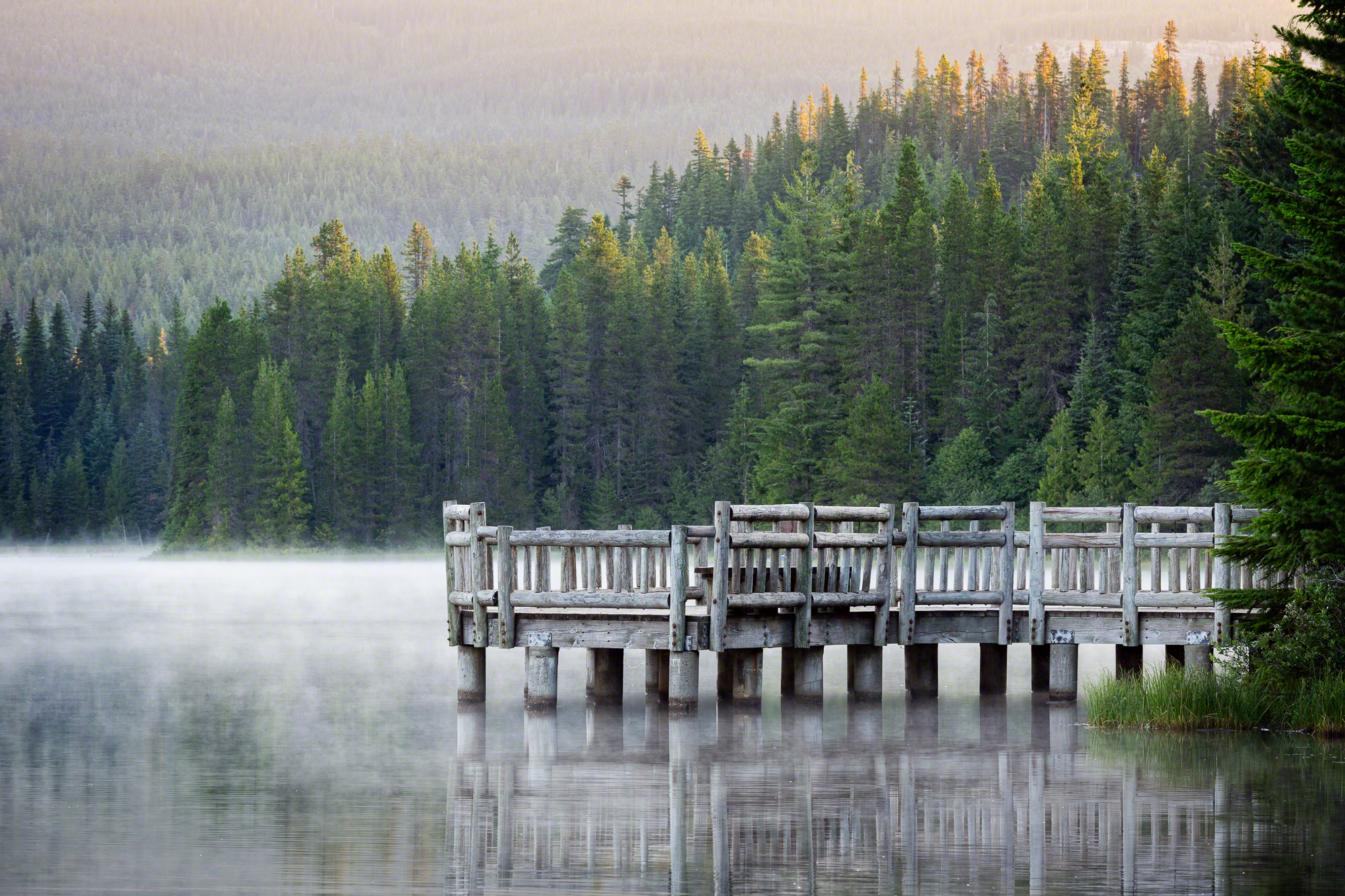 For this photograph, the sunrise that day was less than inspiring. We had a gorgeous scene in front of us at Trillium Lake, with Mount Hood in the backdrop and the lake in the foreground, but there were no clouds in sight. So I decided to photograph the dock, surrounded by the mist of the lake. There was enough light to get a good image, but the sun had not yet appeared. So I patiently waited, and eventually the light caressed the trees at the top of the frame.