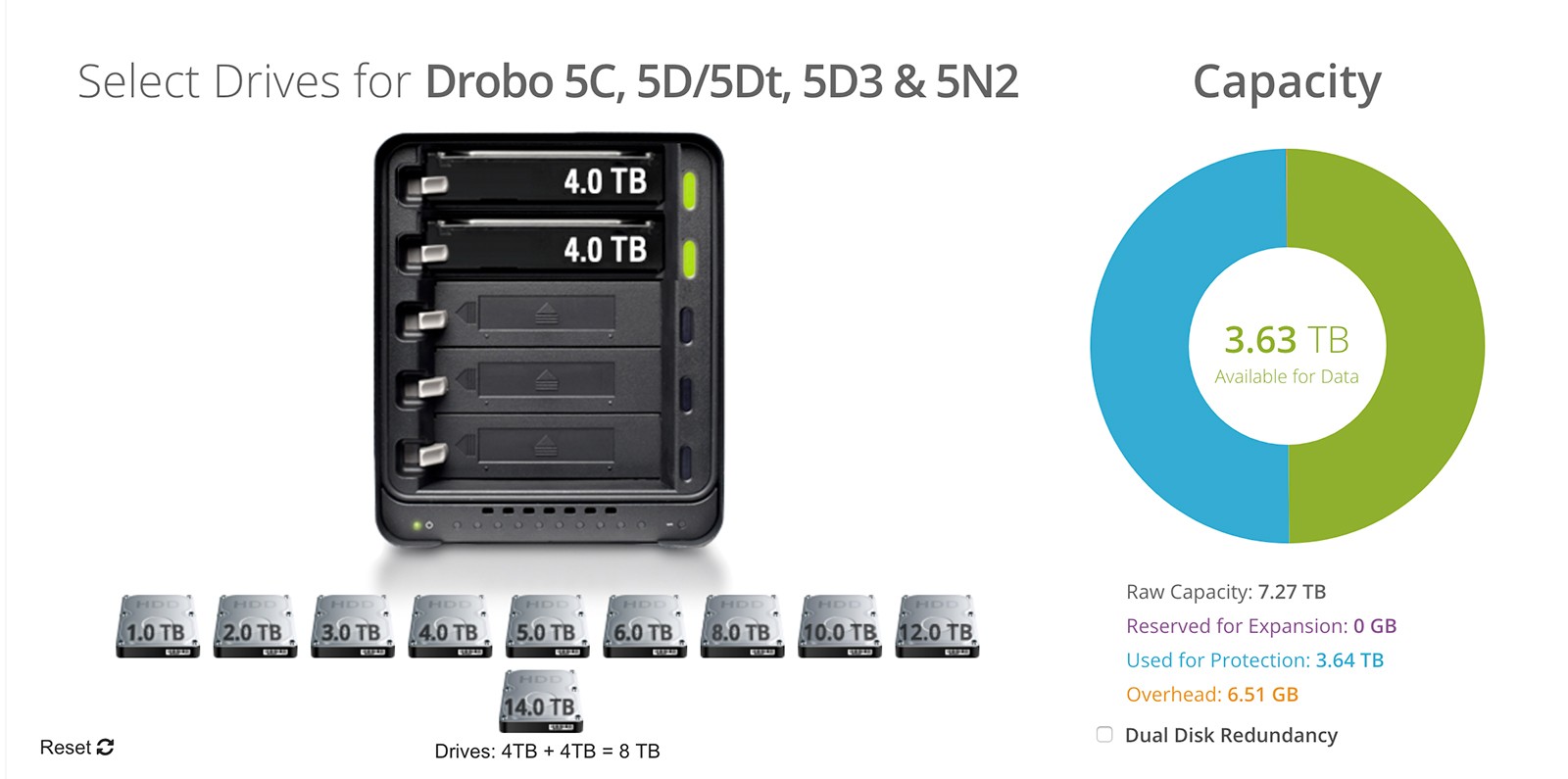So you can see that adding two 4TB drives will give me 3.63TB and that the Protection System is using 3.64TB. This Protection System is what allows one hard drive to fail and I won’t lose my data. Here is more information on how Drobo handles a failed drive.