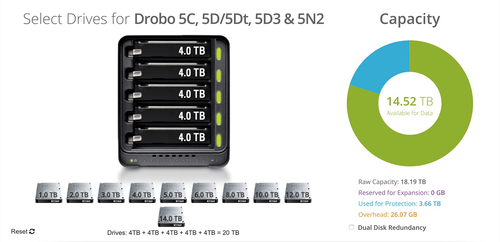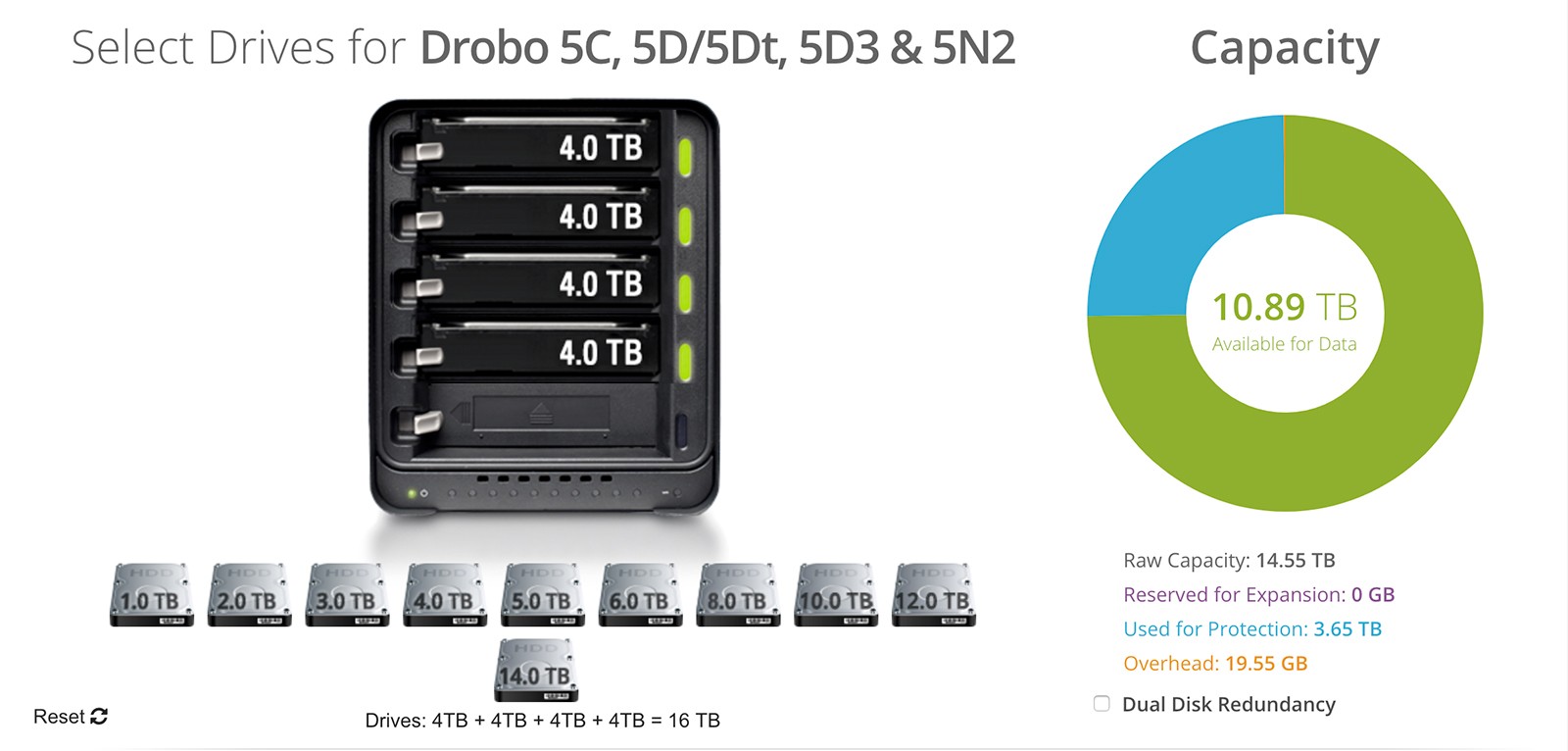 My being on a budget, I decided I’d use the Drobo Capacity Calculator located here, to determine what size and how many hard drives I’d start with. I figured that I’d want at least 4TB drives and so I added those to the Capacity Calculator and it showed me this.