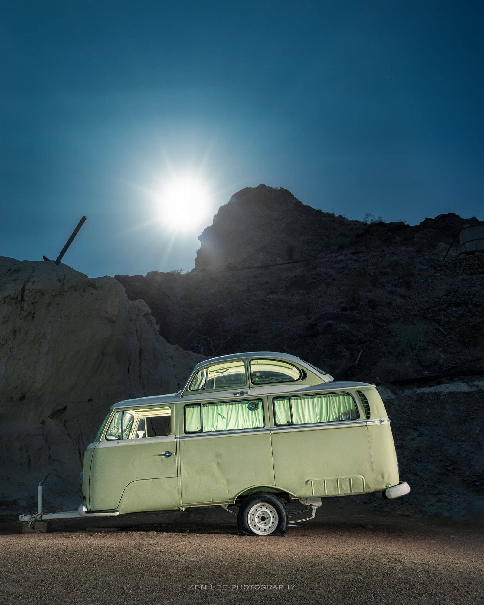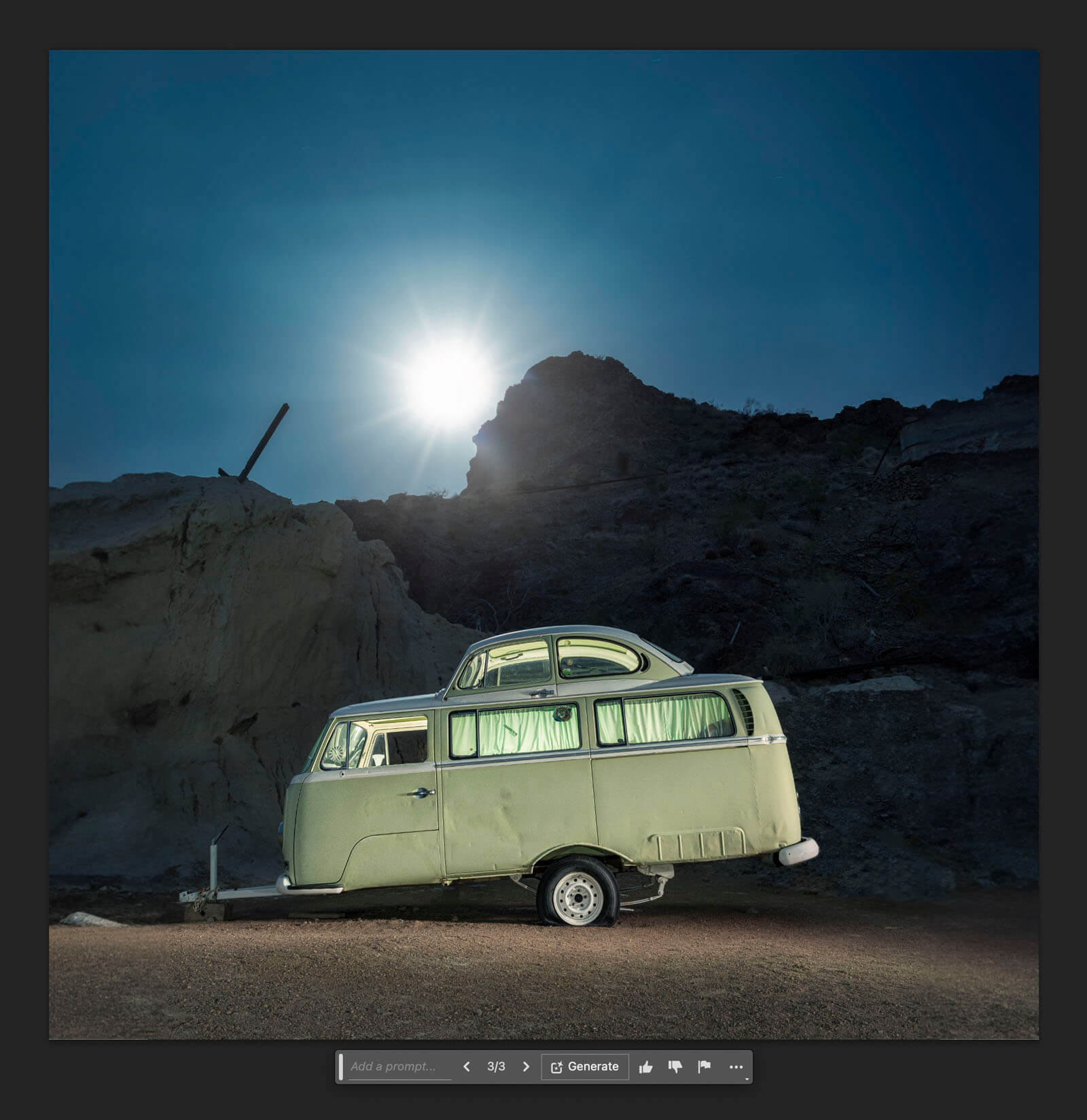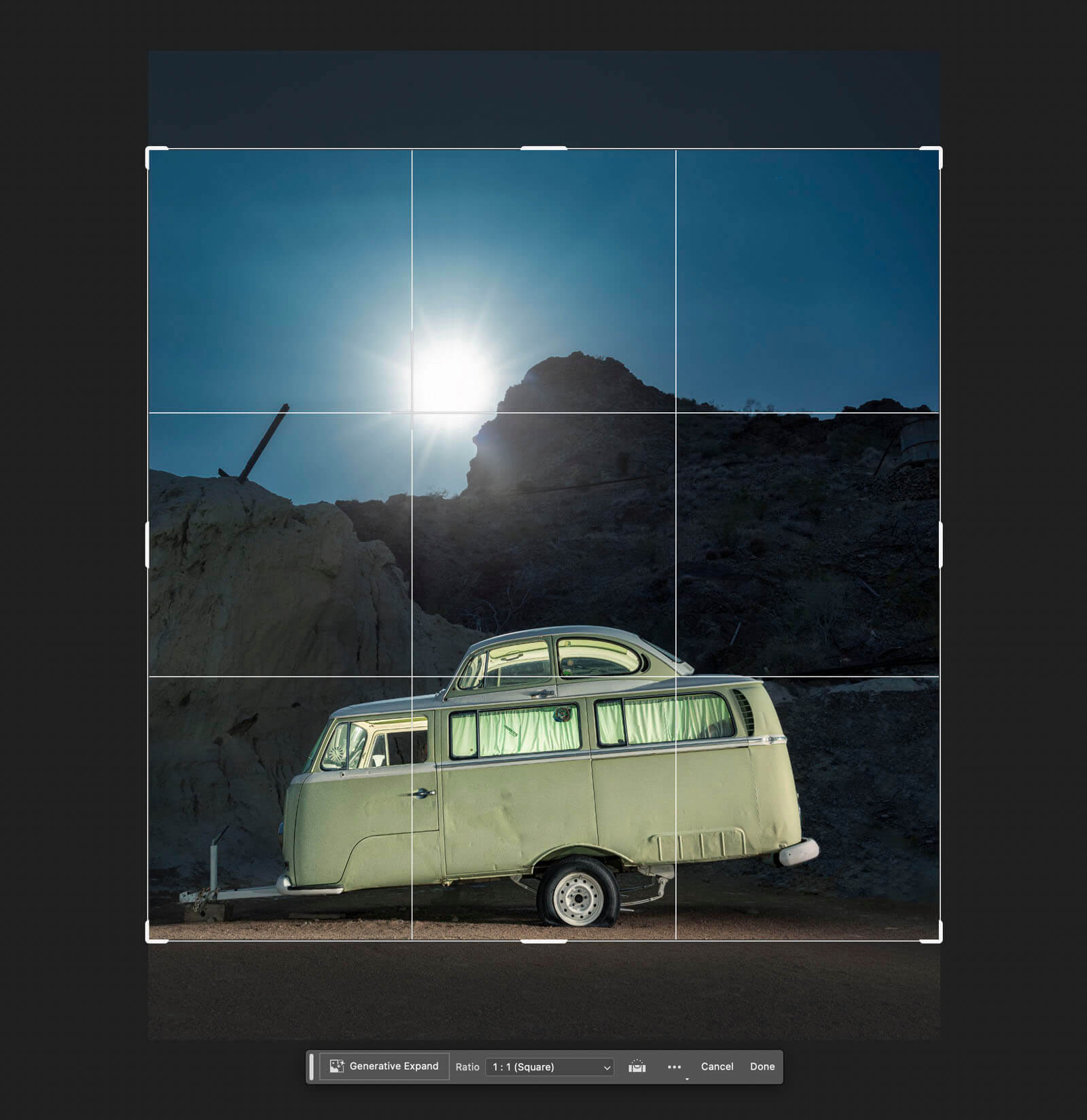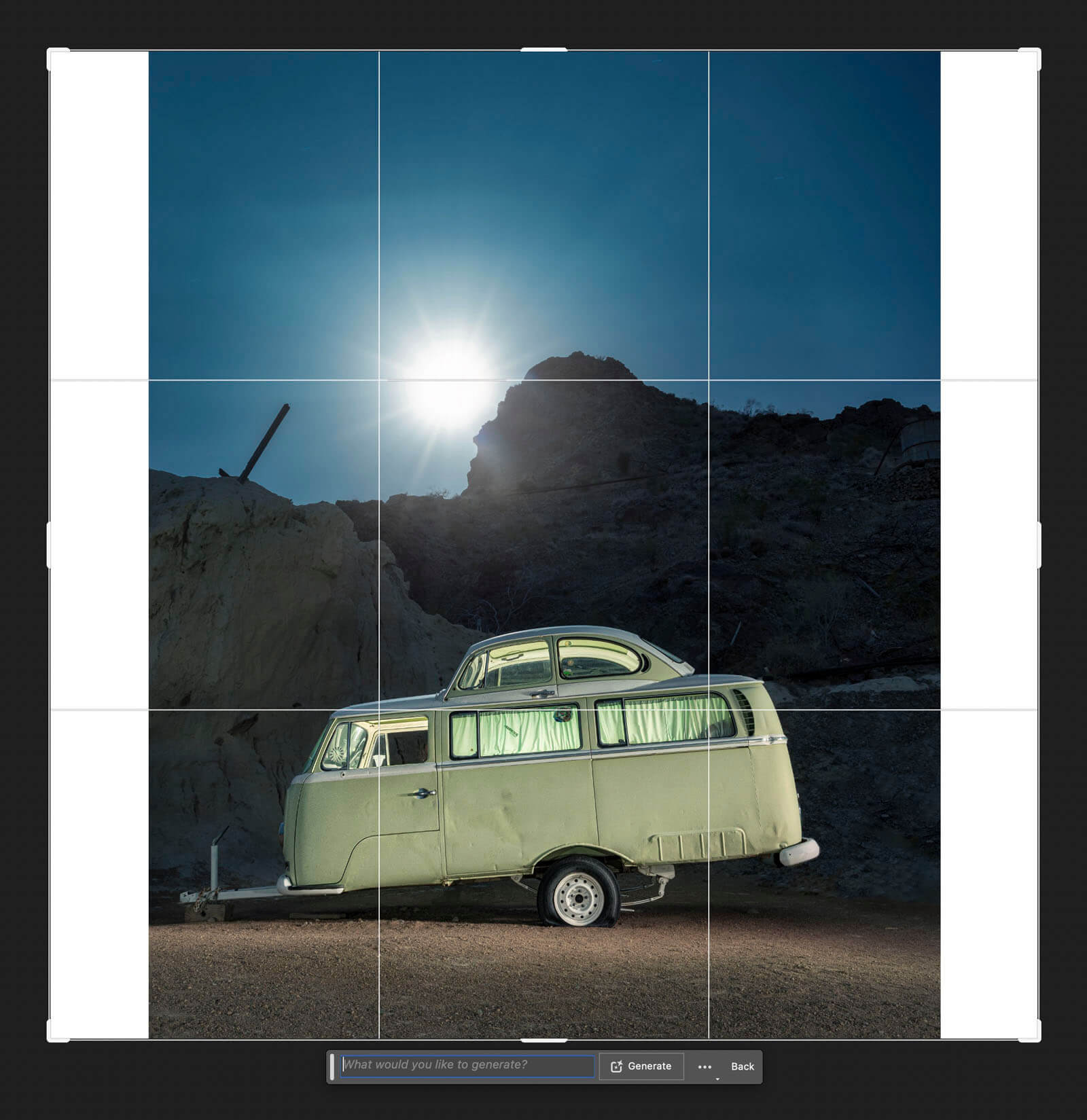 For the first example, I will use a night photo of a bizarre VW camper made of a van and bug kludged together. What I want to do here is make this into a square ratio without cropping any of my existing photo using Generative Expand. The latest update to Photoshop beta (v. 25) makes this much easier to do, adding this in a nondestructive layer.