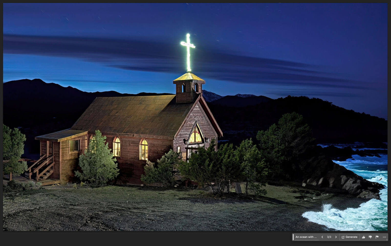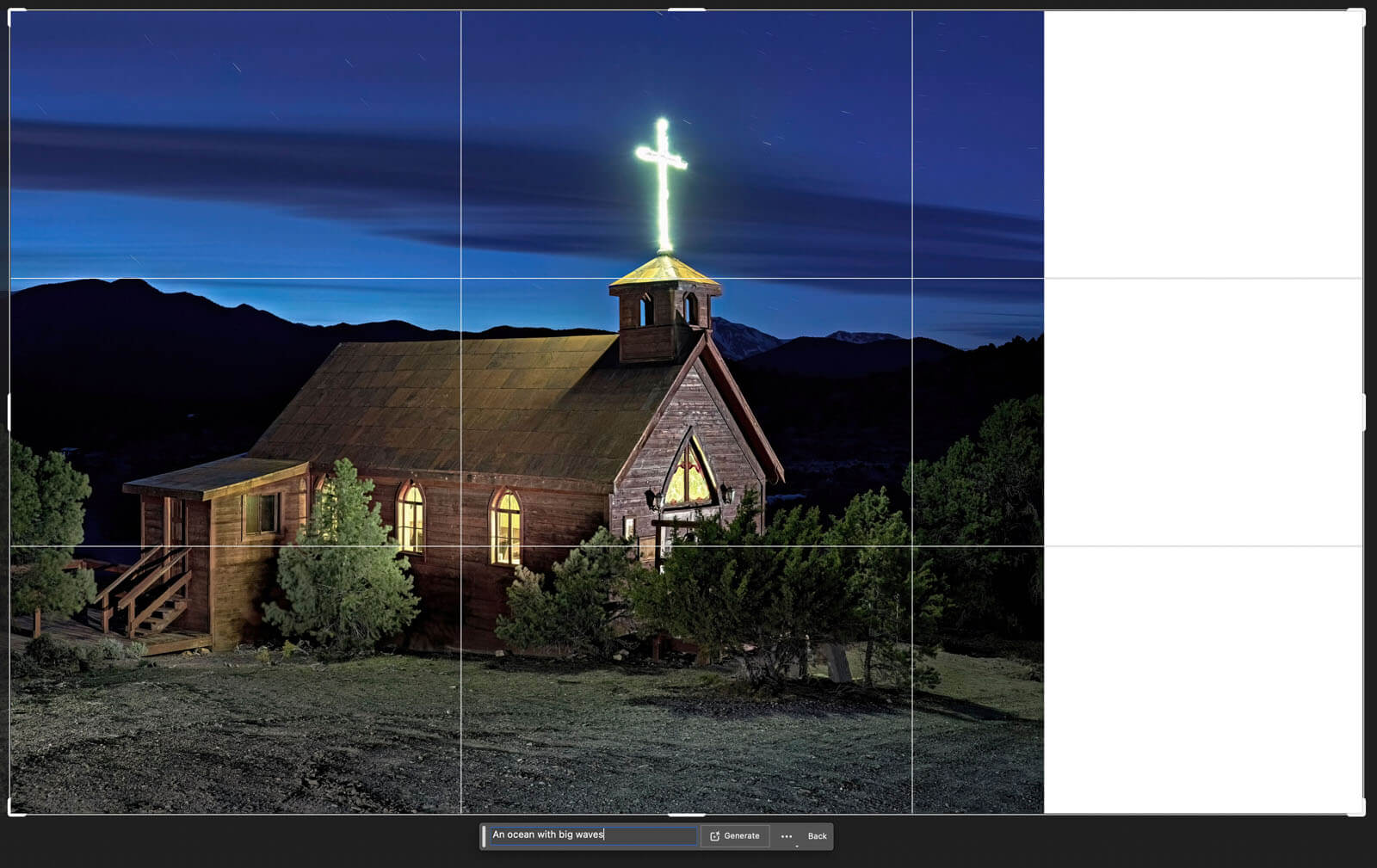 Generative Expand has not only created three variations of the ocean, but it has also matched the general color scheme and mood of the photo when creating this fantasy image. Now the churchgoers will need to keep the doors closed if they don’t want ocean spray during their sermons.