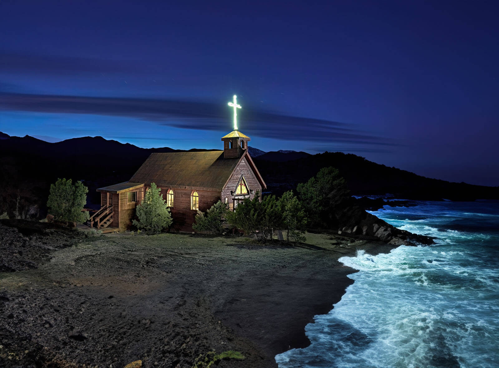 For the second example, I will use this night photo of a beautiful wooden church at 7400 feet in the mountains of Nevada (I wrote about how I lit the church at night here). This time, we’ll create a new “fantasy image” that might alarm the town’s residents if they saw the ocean rising to this alarming level. Who knows, though, perhaps the church might enjoy having beachfront property in this landlocked locale. Here’s how I easily made this happen.