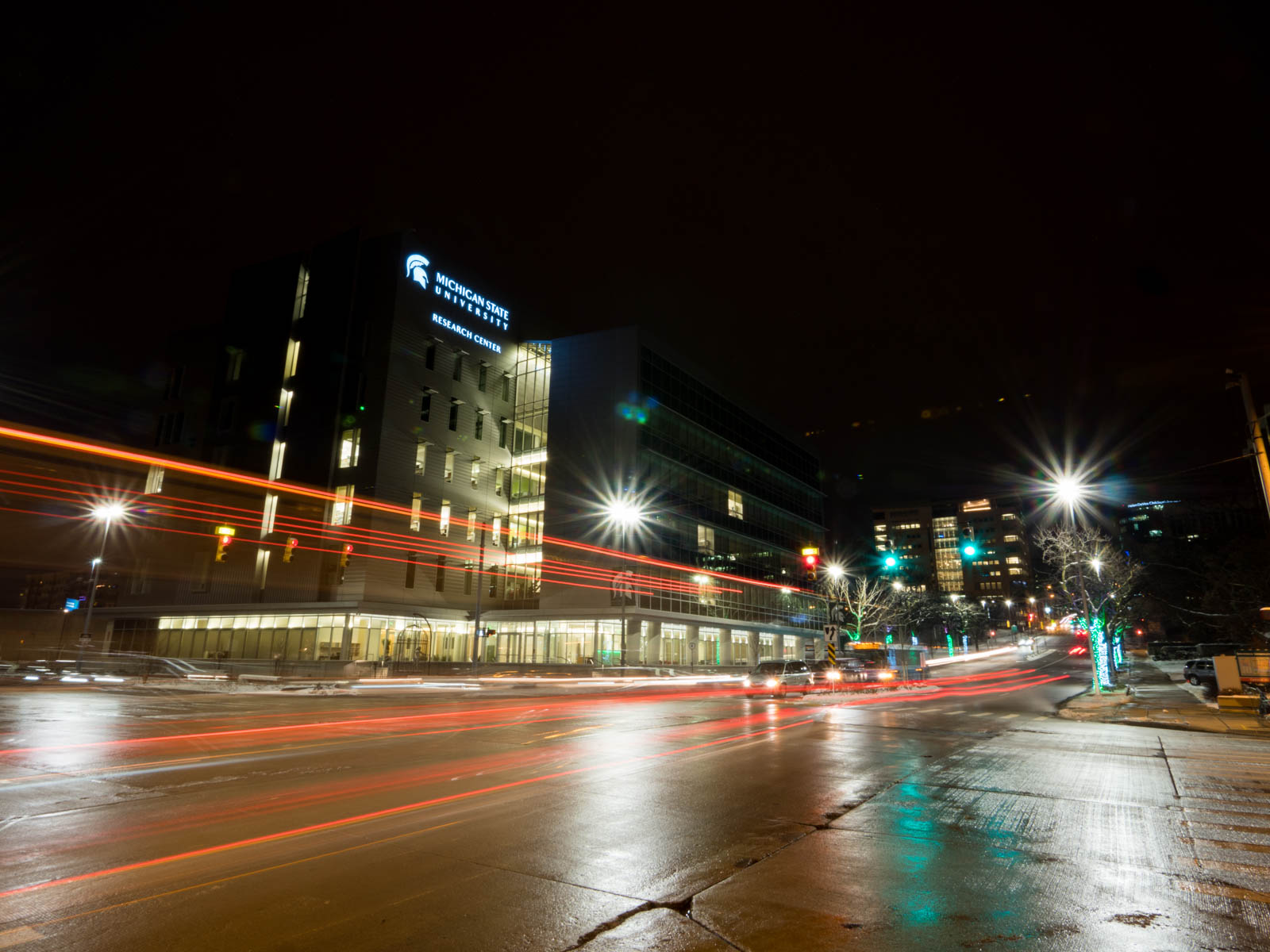 Ultimately, I had to put my Panasonic 7-14mm lens to the test, photographing Christmas lights downtown. I was asked to provide a wide view, so my idea was to capture a long exposure that highlighted not only the Christmas lights on the trees but also the tail light trails.