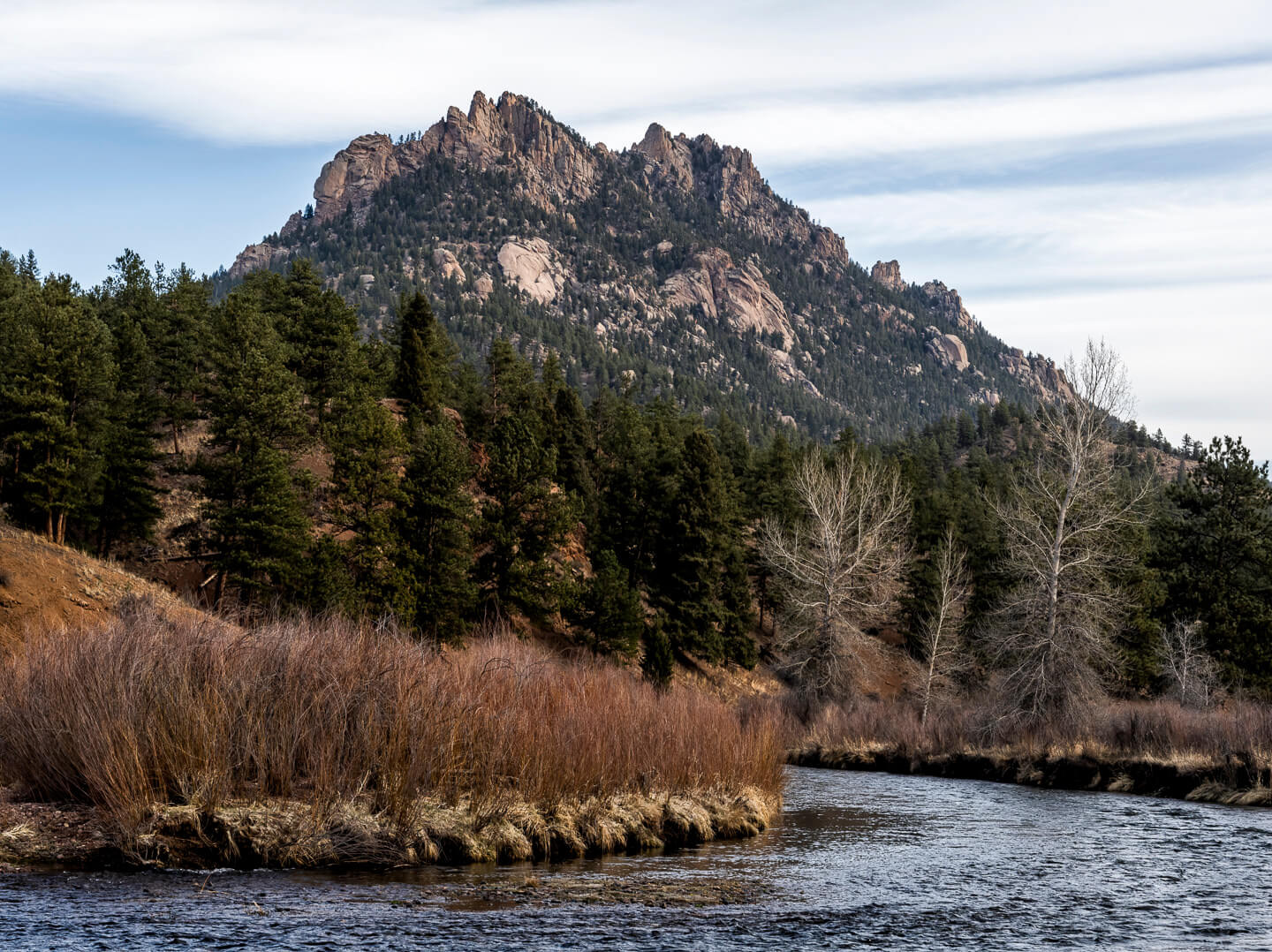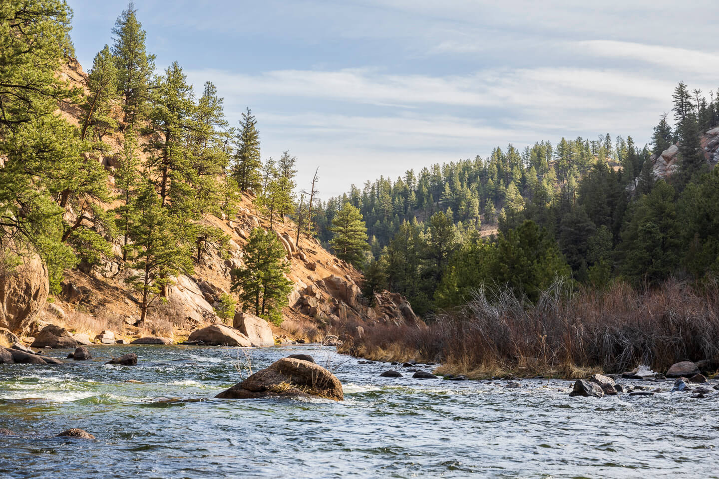 Near Deckers, Colorado, The South Platte River carves its way through the boulder-strewn Cheesman Canyon, providing many unique scenes. It is a very popular destination for fly fishing and is one of several gold medal waters in the state of Colorado. The canyon’s natural beauty, its popularity with the fly fishing community and outdoor enthusiasts helped protect it from the proposed $1 billion Two Forks Dam project, which was vetoed by the EPA in 1990.
