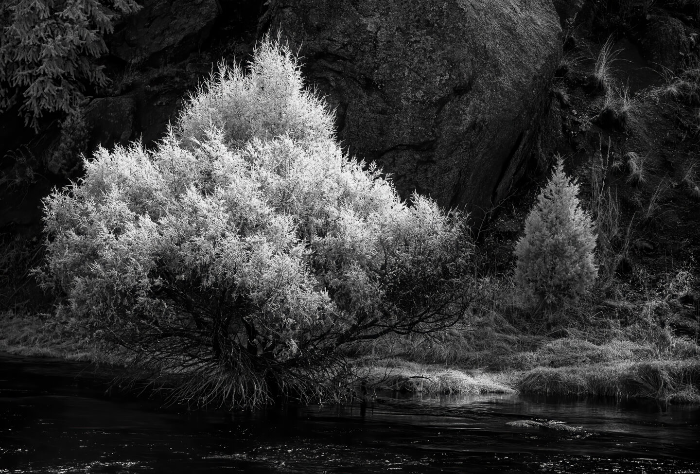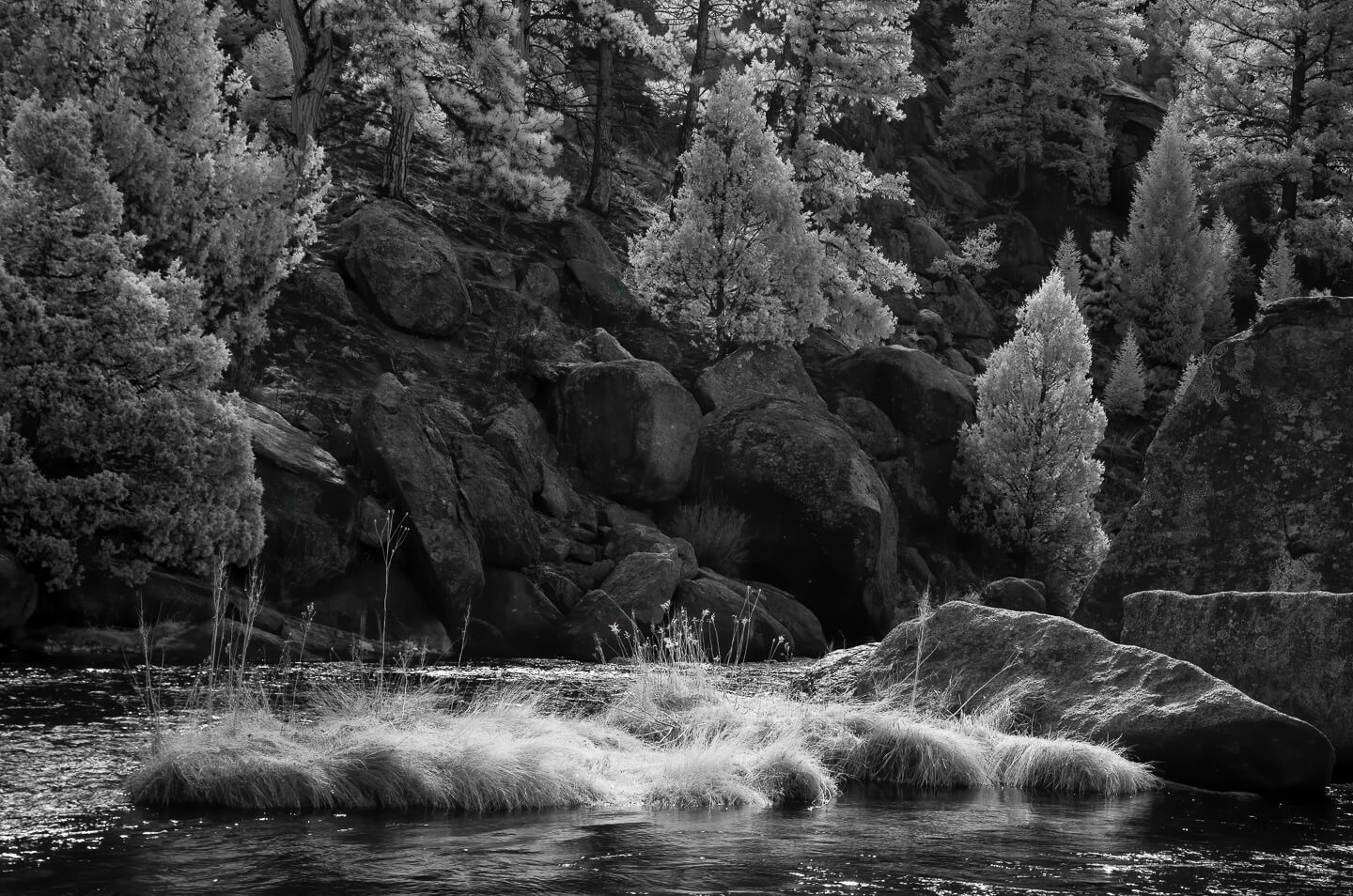 When the sun came over the ridge, the light became harsh with strong contrast and bright highlights on the water. I was hoping for clouds that had been in the forecast to show up and help diffuse and soften the light. I turned to my infrared converted camera to take advantage of scenes that work well for black and white conversions.