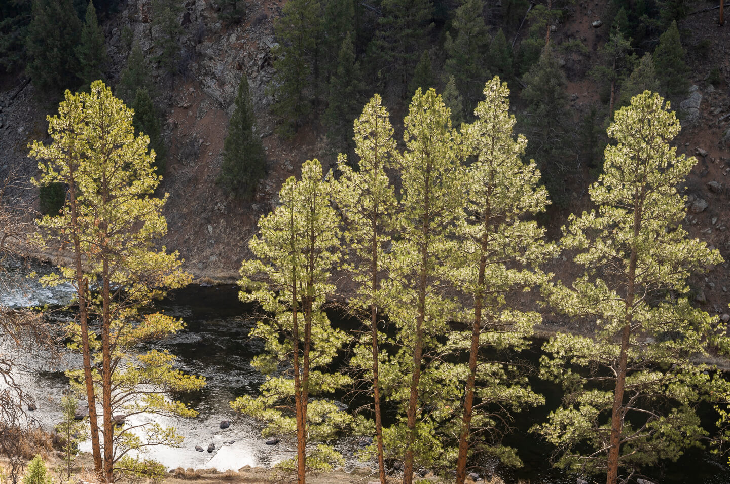 Deep canyons can be challenging to photograph, as soft light is difficult to find. By the time the sun gets over the upper ridge of the canyon, there is a short window of decent light that soon becomes harsh. During this short period of good light, I look for smaller scenes where specific subjects become illuminated by pockets of light. Oftentimes this will be a small group of trees or a single tree along the banks of the river.