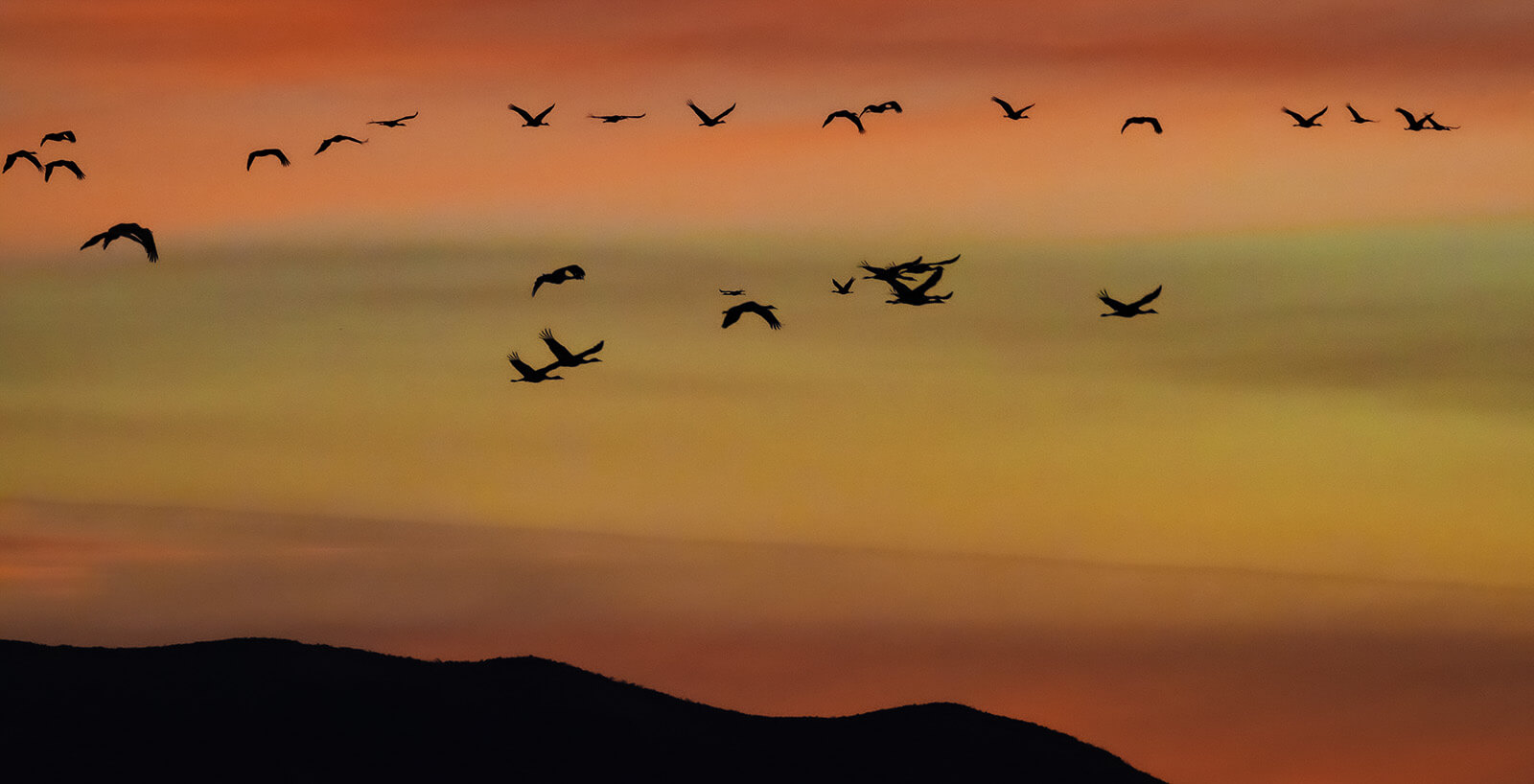 Silhouettes are extremely unforgiving. Here are two scenic silhouettes against a gorgeous colorful sky. One below and one headlining this article. These were taken from the same set of birds as they went on their way through the scene. Note that in one image all sandhill cranes are visible and readable. In the one below some of the birds clumped-up making for large darker undefined voids.