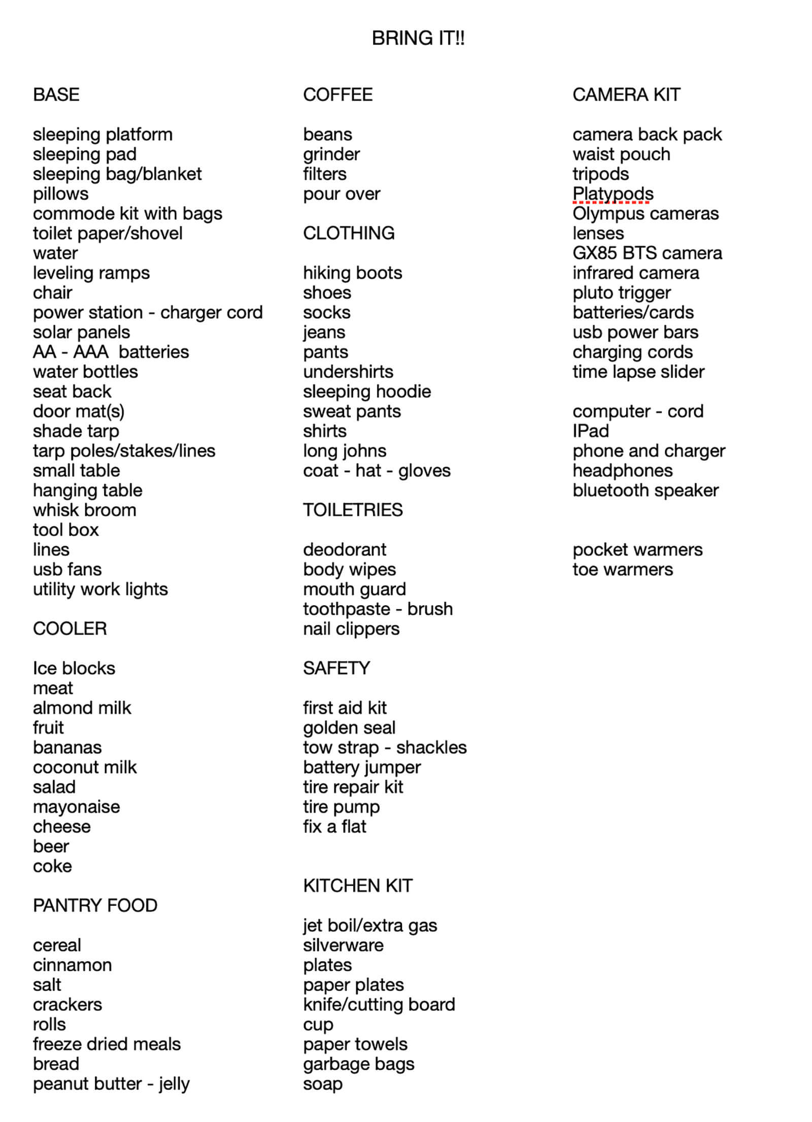 It’s amazing what a list can do to make sure you have everything you need, and everything you want with you on your expedition. My friend Jose Robertson is always pointing me toward becoming a better road tripper. He shared his list with me and made me think, “Why don’t I have one of these?”