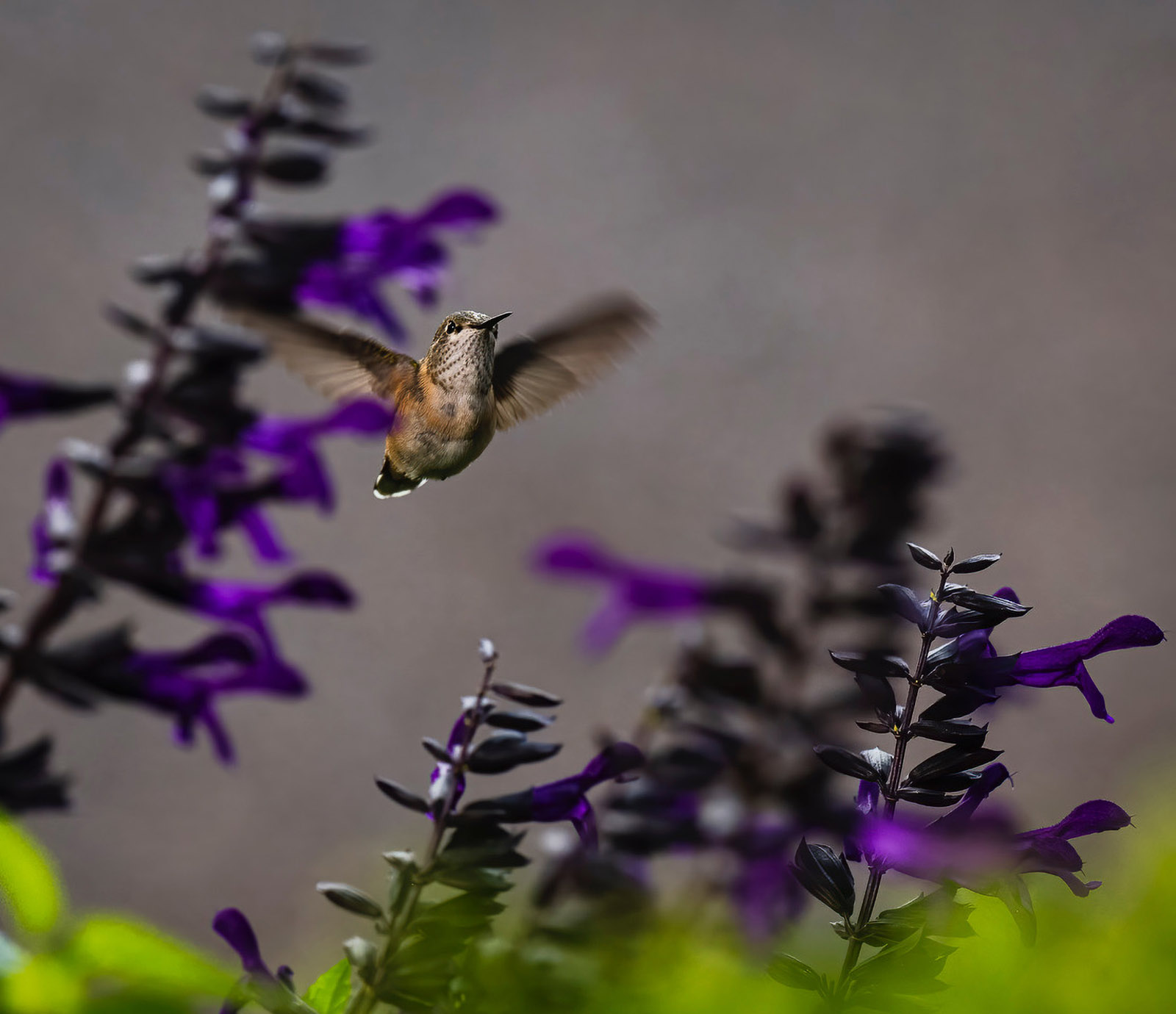 My initial photos of these very fast-moving birds were unimpressive. They were often blurry due to the challenge of maintaining a fast shutter speed in low early morning and late evening light when the hummingbirds tend to be more active. Occasionally I would get “lucky” when a hummingbird would move into a brighter area within the scene, which increased the shutter speed to an acceptable level while using aperture priority on my camera.