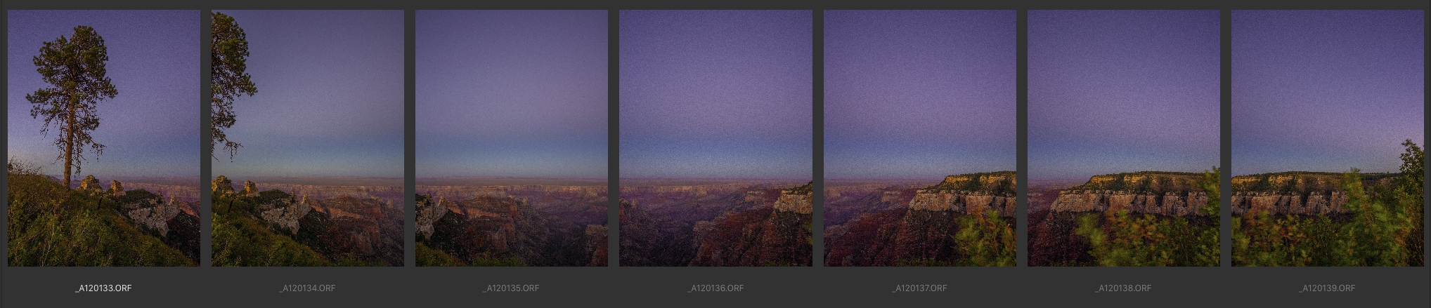 The first lesson would be to not rush, as I was, when taken by a scene. I was enamored with the sky, lone tree and canyon. I wanted to frame the scene and did not take into account the blowing wind’s effects. My attention was tuned to obtain a larger file using a double row panorama. Onward to the exposures.