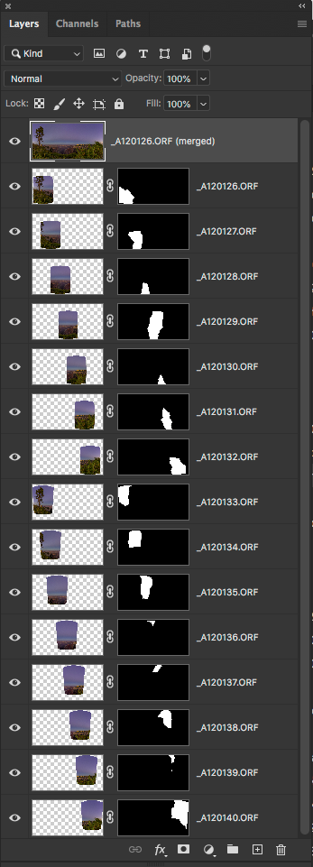 Here’s what the file looks like after processing. Photoshop blends the images together using masks. Before you flatten the image, check along all lines of the mask to make sure the blending doesn’t need any tweaks. Turn on and off layers to check.