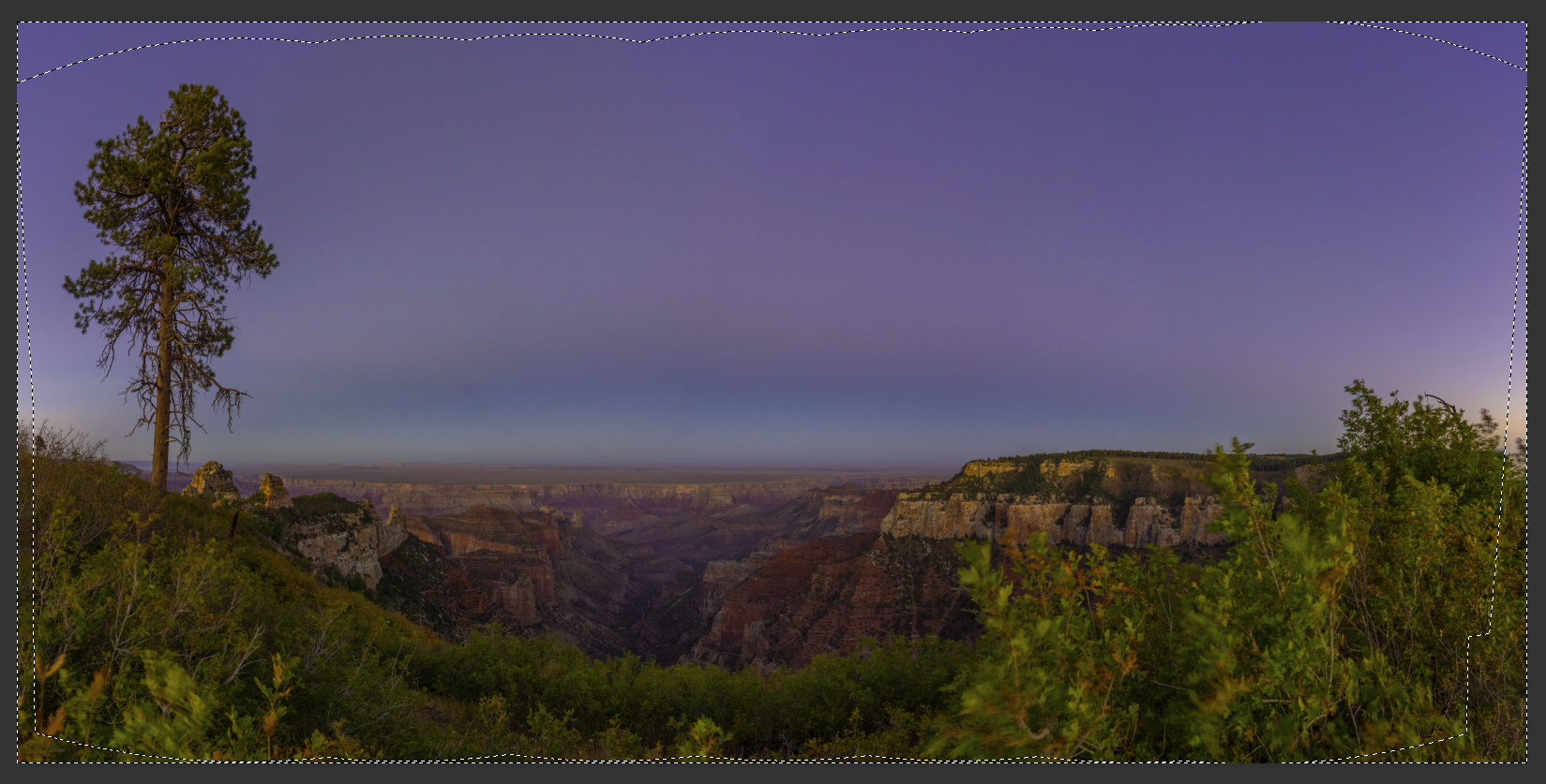 Photoshop does a great job of bringing the pieces together. Note the slight curvature of the sky toward the sides of the image. That’s because the light entry point of the lens, AKA nodal point, was not over the pivot point of the tripod.