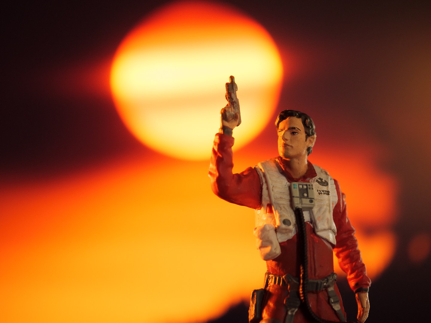 Think about where you’d like your subject to appear. Star Wars is famous for dramatic environments, and I like to photograph that kind of thing, too. This background is the sunset during a forest fire I made ten years ago. I used a telephoto lens to make the sun look larger. It seemed like a good choice as a classic Star Wars backdrop.