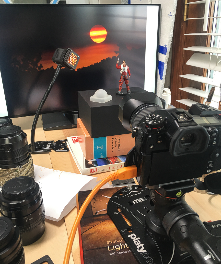 It’s much easier to manipulate the camera perspective than a tripod. If it’s too low, add a book. If it’s too high, put a book under your subject. I used a Max (B&H | Amazon) for my camera and an Ultra (B&H | Amazon) for the lights.