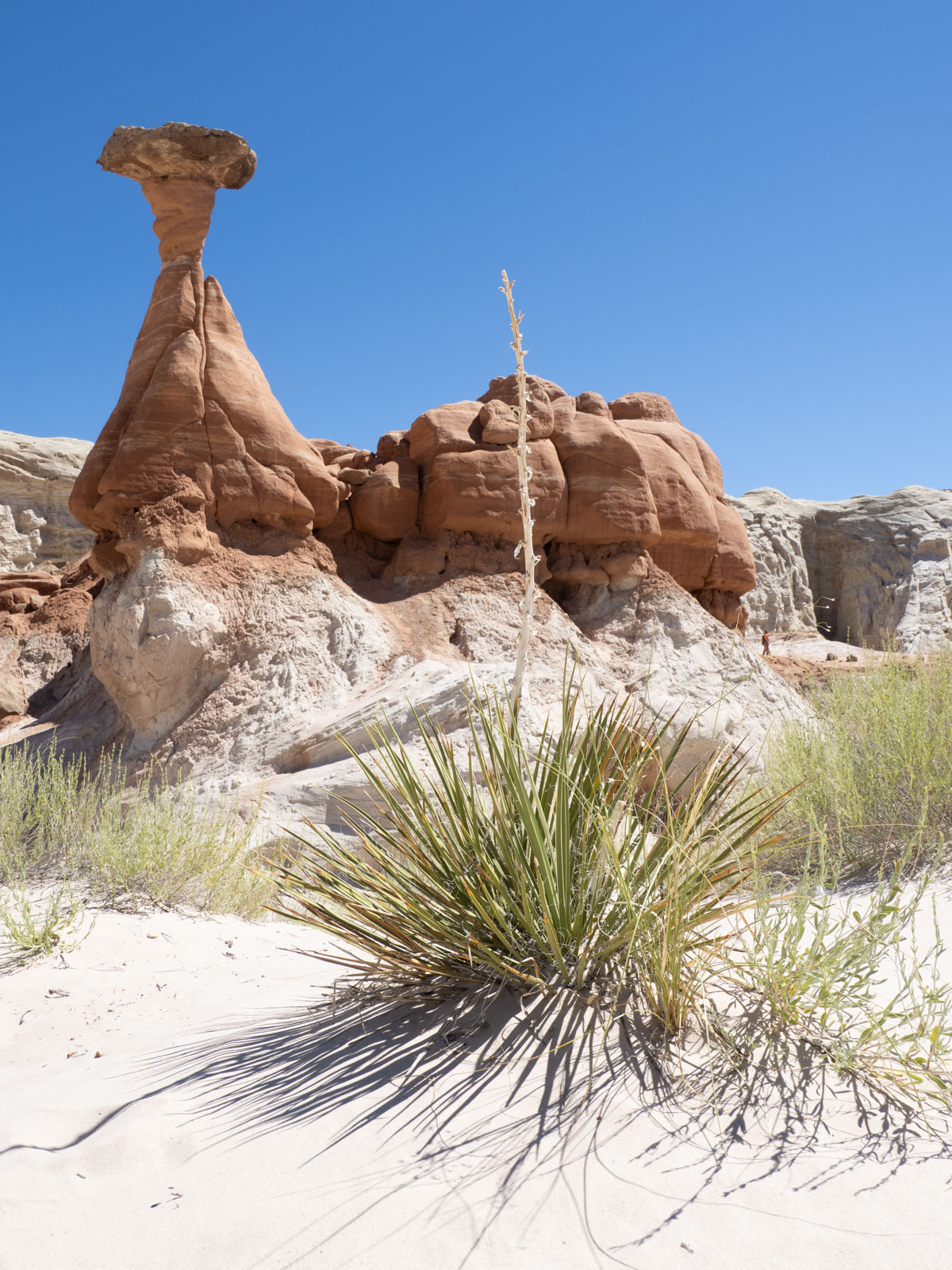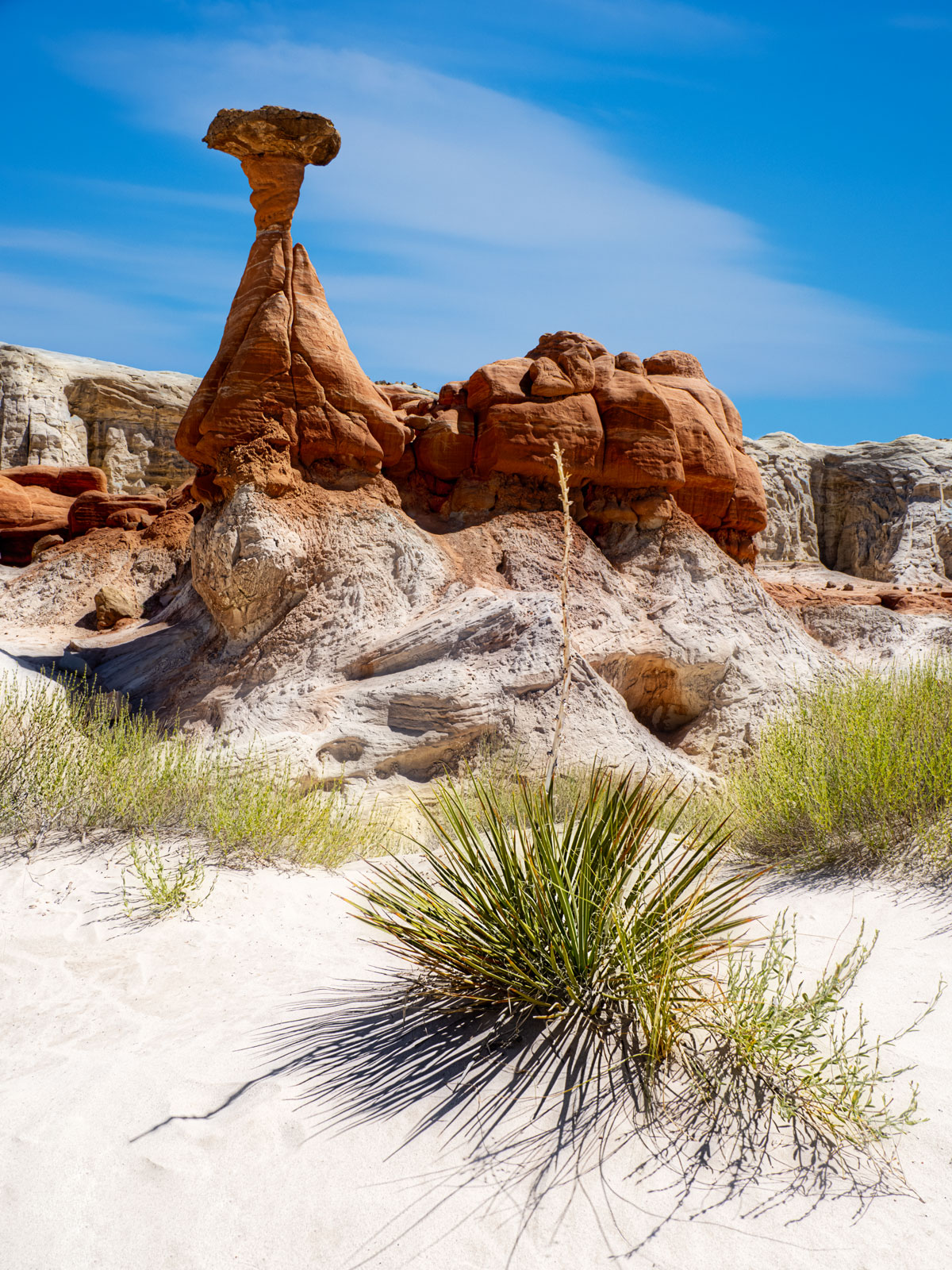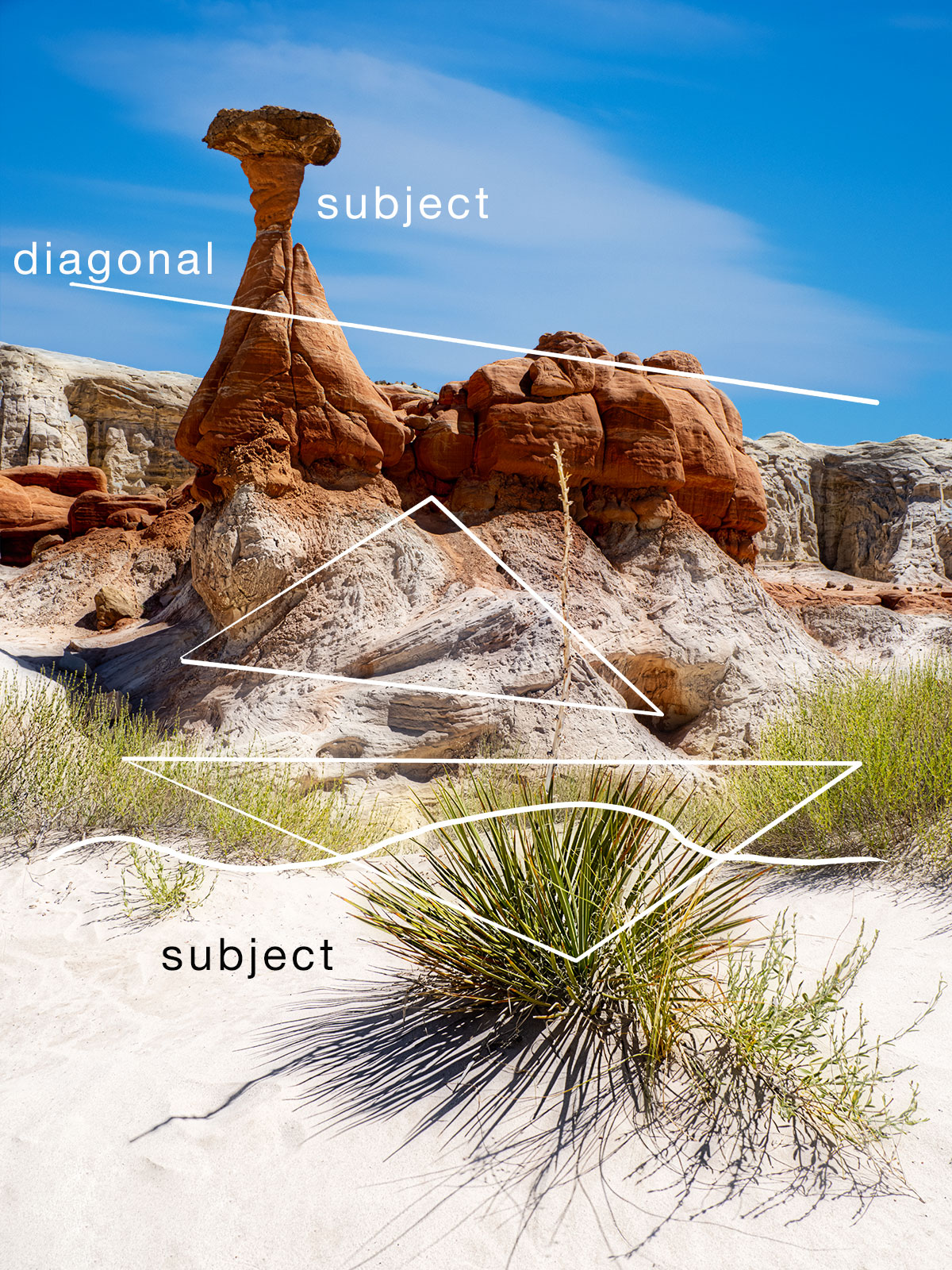 I felt the need to have a foreground element to balance the towering toadstool. A yucca plant that fit the bill. This gave me two subjects on power points at a diagonal from top left to bottom right.