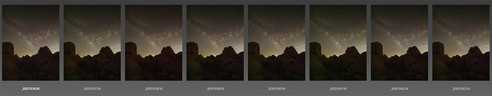 The sky exposure was eight seconds at f/2.8 at ISO 8000. To get more color and light detail, I made the same exposure eight times and blended them together with Starry Landscape Stacker. This has the net effect of gathering more starlight as if there was a longer exposure.