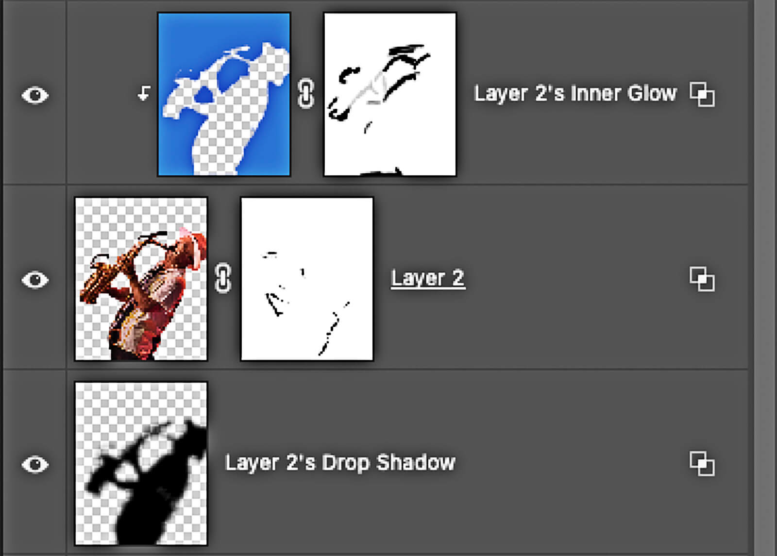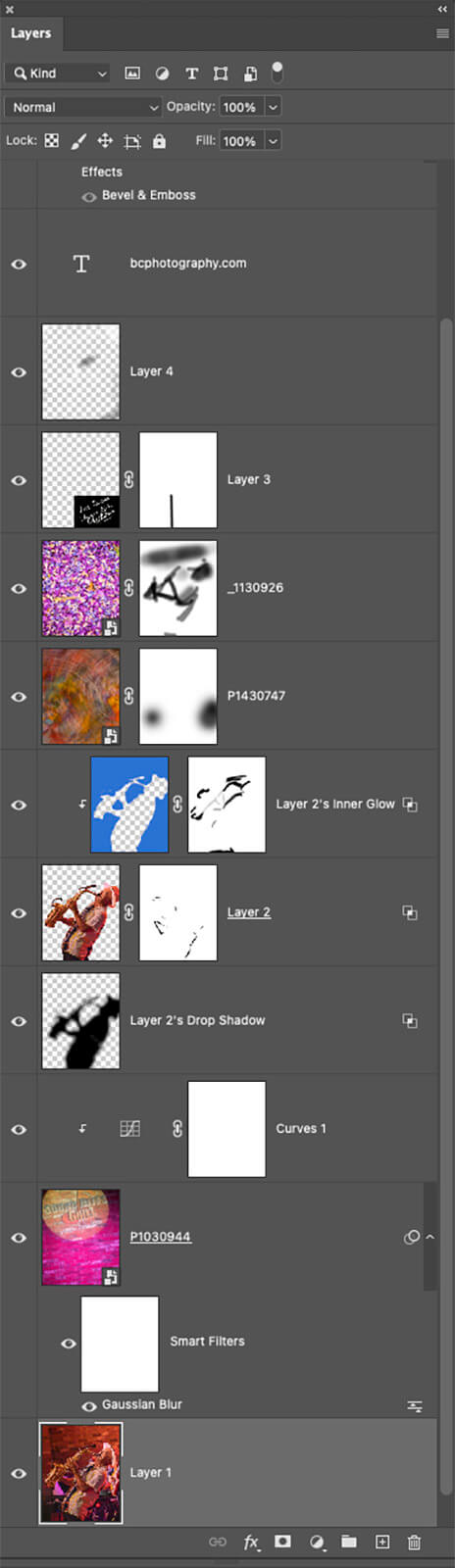 Once the subject is isolated and placed on its own layer, it’s time to place the background. Adding Layer Styles, AKA FX, enable adding depth and dimension to the image. I often implement Drop Shadow and Inner Glow on my subjects. Often, especially with the Inner Glow, the effect is too intense or in places not wanted. There is a trick to separate the individual effects onto their own layer where you can add a mask to finesse the look. In the menu click Layer > Layer Effects > Create Layer. All effects are then placed upon their own layers. Very cool!