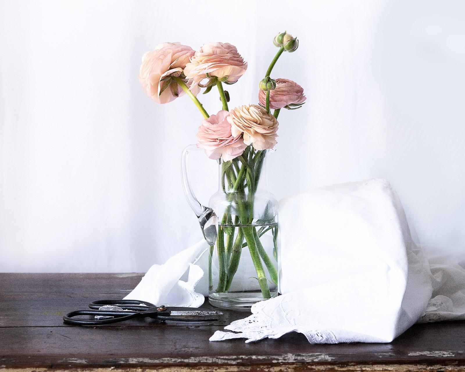 Placing my flowers (Apricot Ranunculus) in a clear glass vase and filled three-quarters full of water on the table. I have found that this level of water creates a nice balance — too full or too little does not look quite as aesthetically pleasing, but that is personal preference. I have placed some vintage white cotton around the vase, this also helps reflect light back into the image. The dark bonsai scissors were added as a contrast point and to help tell a story of freshly cut flowers.