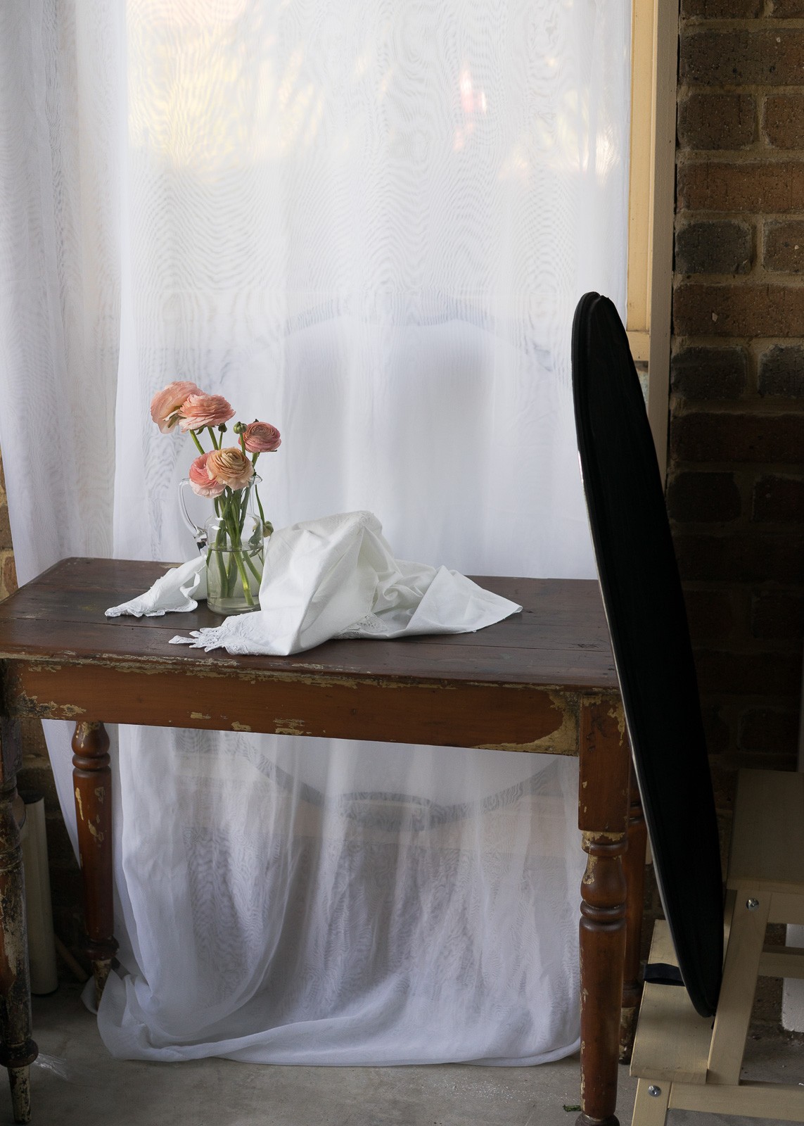 In this image, you can see my setup. I have placed my old chippy table in front of the window, which is east facing with indirect afternoon light. Using a double thickness sheer curtain hanging and a scrim behind that as well.