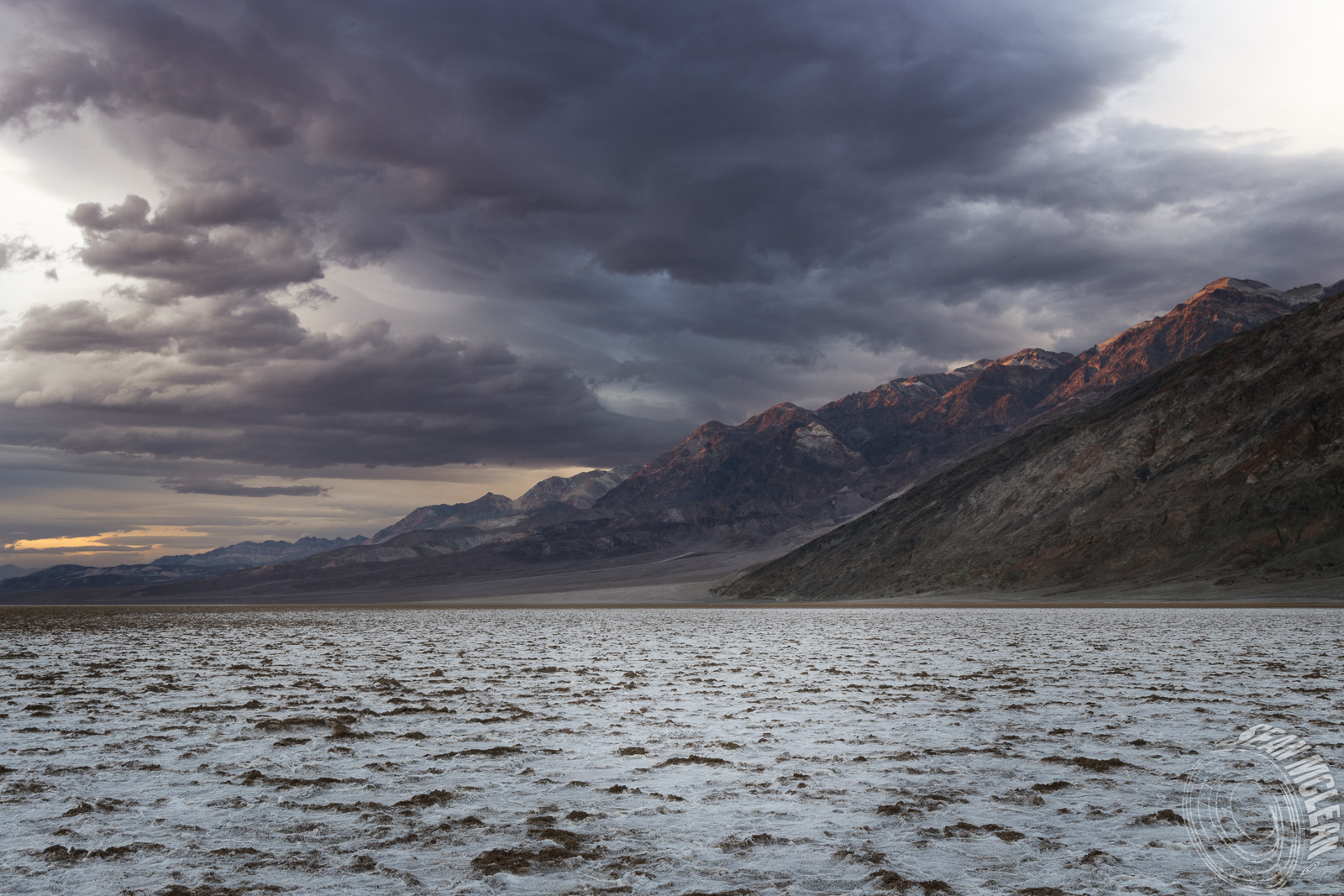 My last day in Death Valley was a mix of spectacular, dramatic light and a wind storm that kept intensifying. After my stop at Artists Palette I headed south to Badwater Basin. The National Park Service placed a sign here saying that it’s the lowest point in North America. What’s really freaky is looking high up at the marker for sea level. You’ve undoubtedly seen photographs of hexigon-shaped formations in the salt flats.
