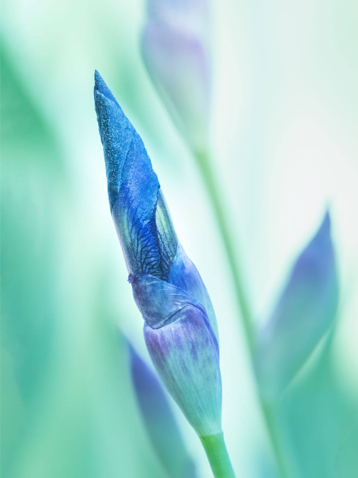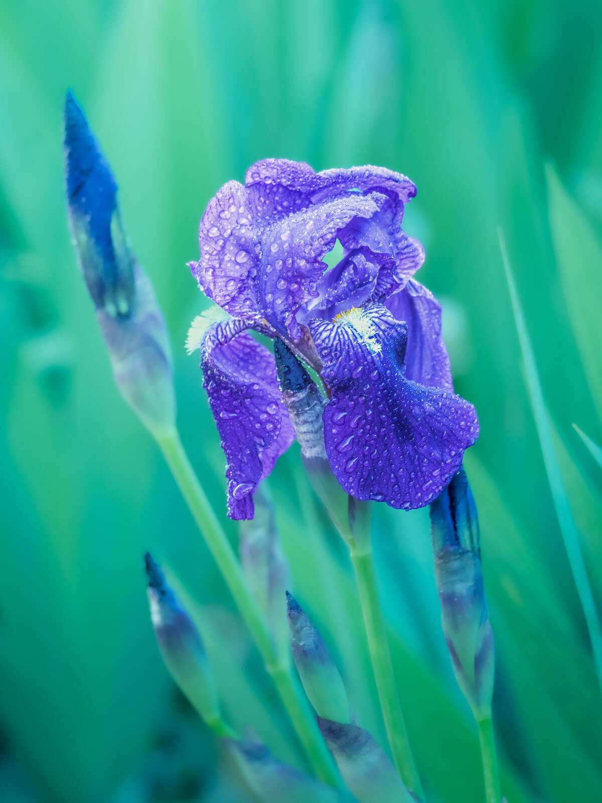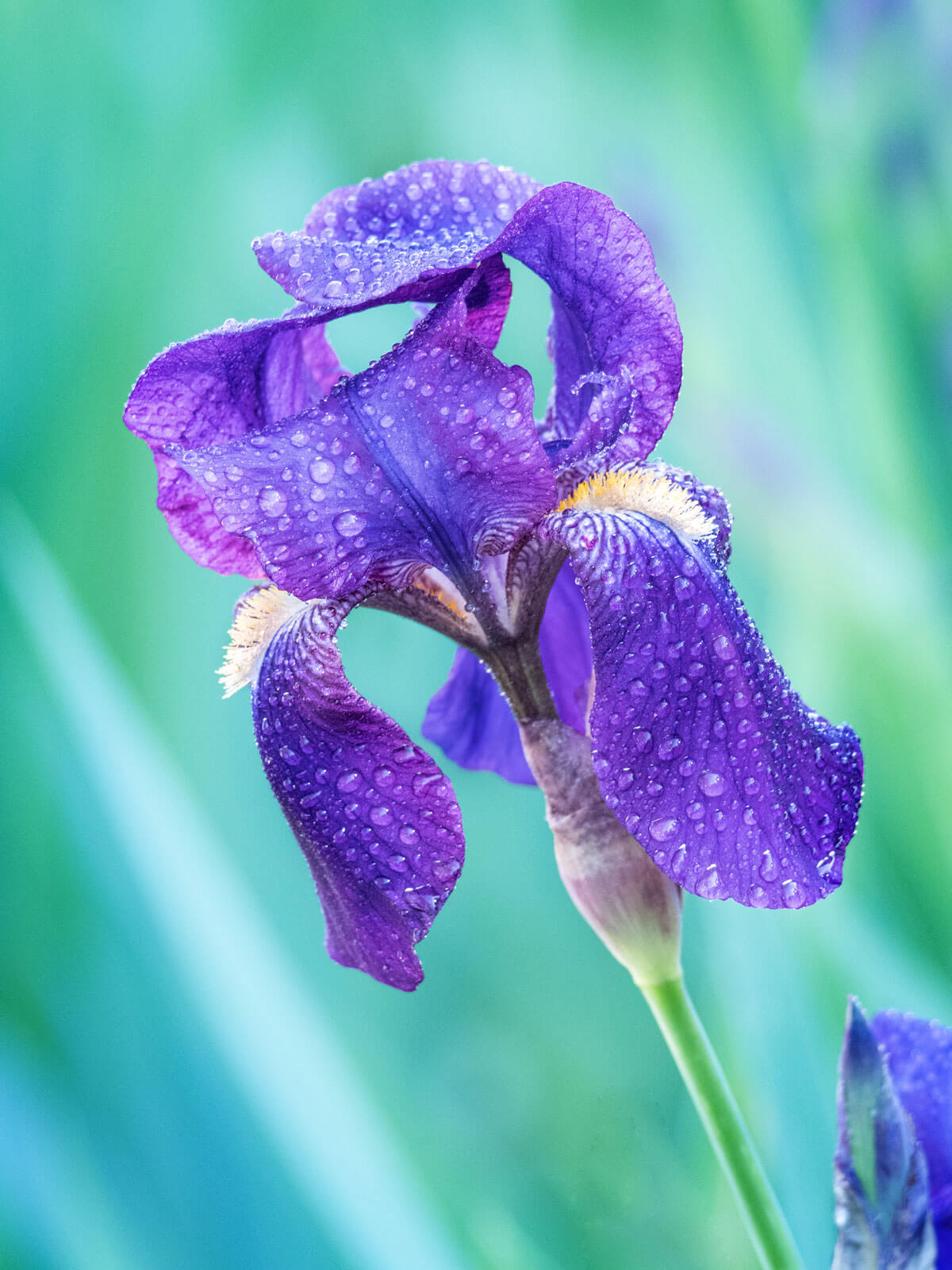 Iris flowers are one of my favorites to photograph. The willowy petals and intricate shapes and form never cease to amaze. Photographing on the edge of sunshine with the subject in the shade worked well for this image. A spray bottle set to mist was used to add the water droplets. Adding droplets adds just a bit of interest and the feel of morning mist. Here in Sedona, in the high desert, that is a rare sight so a little help is in order. When adding droplets, set your bottle to the finest mist possible. Then, spray with lots of passes to build up the drops. If you try to use larger drops right away they will slide off your subject quickly and you’ll loose the effect.