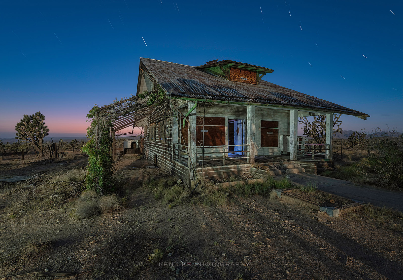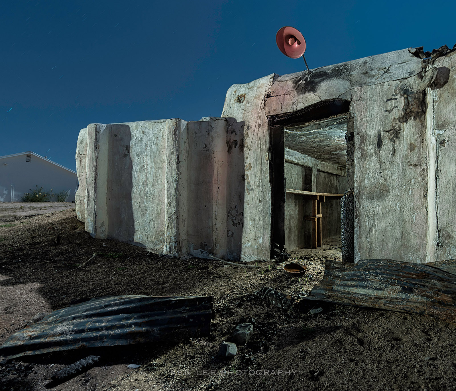 Above is what appears to be an abandoned charred back storage area of a house in the Mojave Desert. I am guessing that this fell victim to the apocalyptic Dome Fire in August 2020. This fire has probably destroyed 1.3 million Joshua Trees and killed or affected who knows how many other plants, animals and people. I photographed this quickly before returning back to the car. It had been two beautiful but long nights in a row.