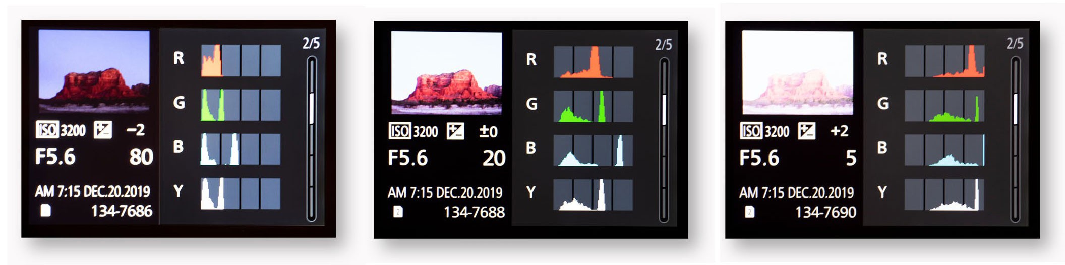 If you do not have the ability to see the histogram before exposing, you have the opportunity after, for review. In other words, you can still check on the exposure values using the ‘picture of the light.’ Above you can see the view from the back of the camera from three separate exposures. If you don’t see a view such as this when reviewing your photos look for a button that reads ‘DISPLAY’ or ‘DSP’ when in Play Mode. When viewing images you can change the display mode on your camera for a view similar to above.