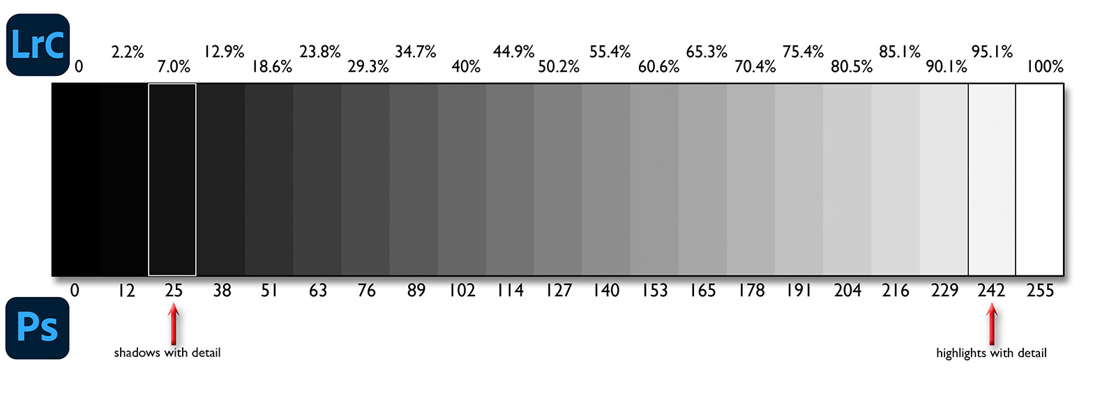The more important values are shadows with detail and highlights with detail. Shadows below 7.0% in Lightroom Classic or 25 in Photoshop will have no detail. On the highlight side of things, values above 95.1% in Lightroom or 242–248 in Photoshop will be lost.