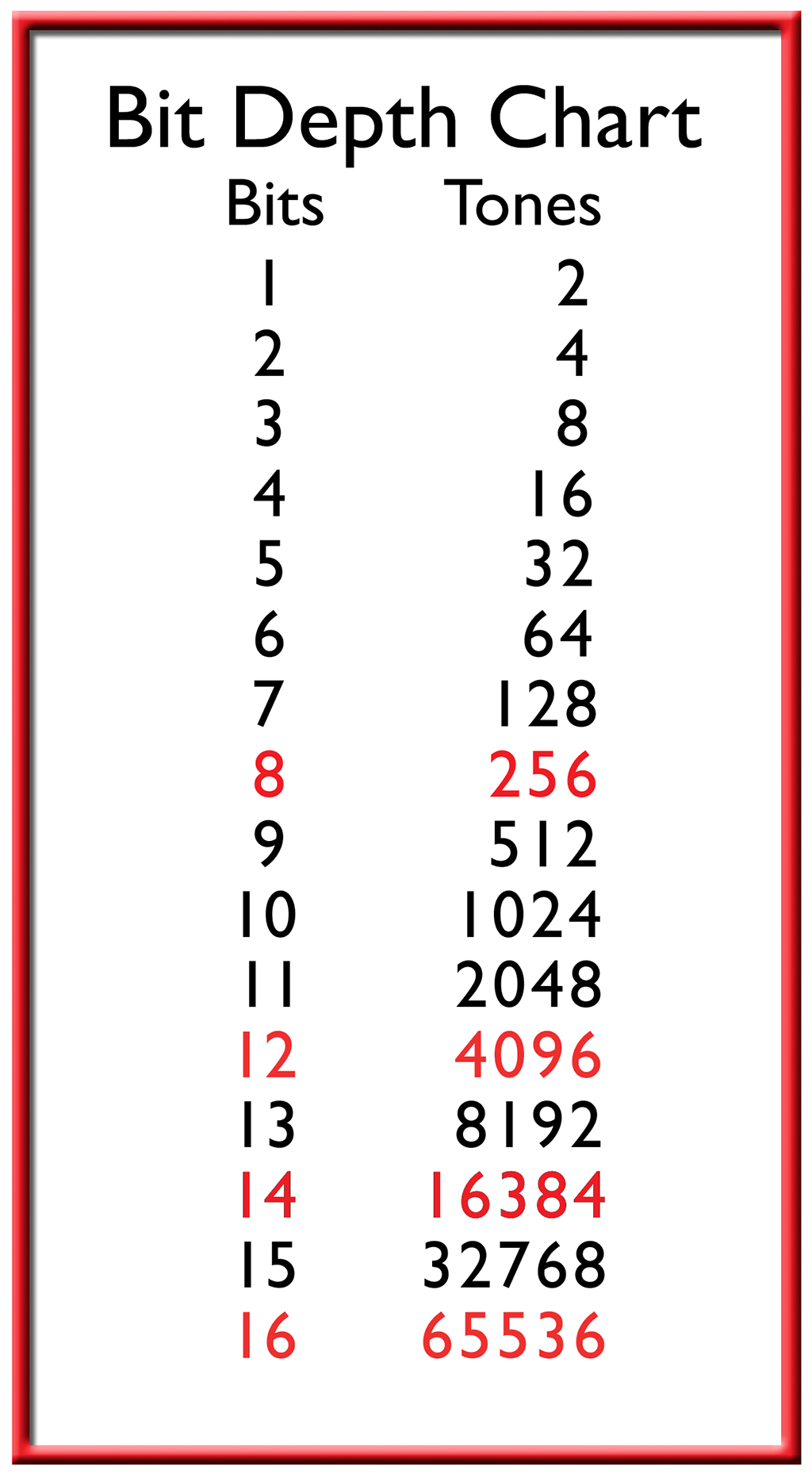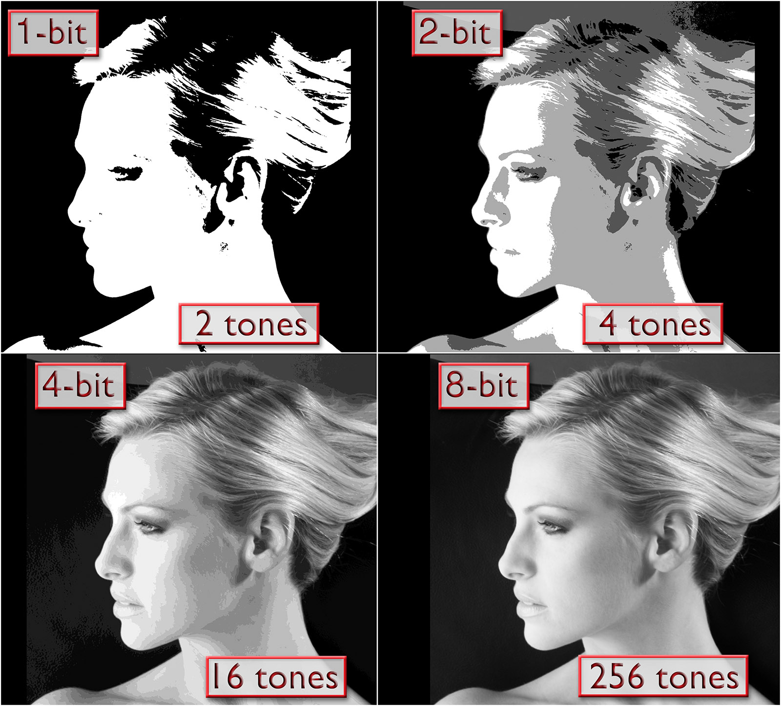 Bit depth is the number of tones a pixel shows. The higher the bit depth, the greater the number of tones. Bit depth is exponential, meaning the number of tones double for every increase in depth. 1-bit is black and white. 2-bits is black, white and two tones of gray. 4-bits is 14 gray shades plus black and white. An 8-bit file has 254 tones plus black and white. Our eyes can’t see the difference in the steps in an 8-bit file. Any file, 8-bits or higher, is a continuous tone.