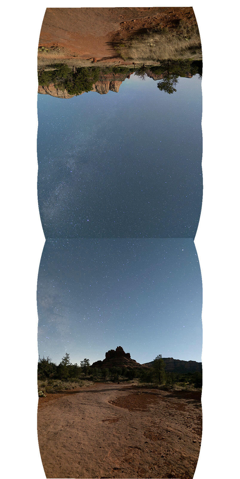 Final step is the following day in Adobe Bridge, Camera RAW and Photoshop. Eight images were processed for the land portion of the scene. Since there was no detail in the sky, Photoshop could not make a complete vertorama. It was able to make four image vertoramas. Then, I merged the sky image including the Milky Way as my base. The land detail images were stripped in over the nighttime landscape. Post processing brought out the detail in both areas and blended for a unified look.