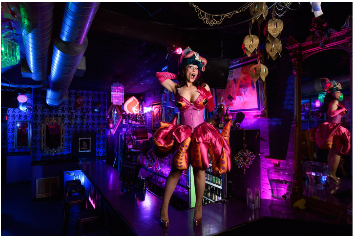 All these disparate folks–a stripper, a clown, a stilt-walking mime, a belly dancer, a fire eater–required a different approach, a changeup in the lighting and the thought process. Photographically speaking, each had possibilities to take advantage of, and each had problems that needed solving. In some instances, I had to work fast. Others required me to completely negate the location space and create a studio. I used big flash and small flash, long lens and wide, emphasized environment or squashed it, and used flash, hot lights and any goddam light that was available, as they say.