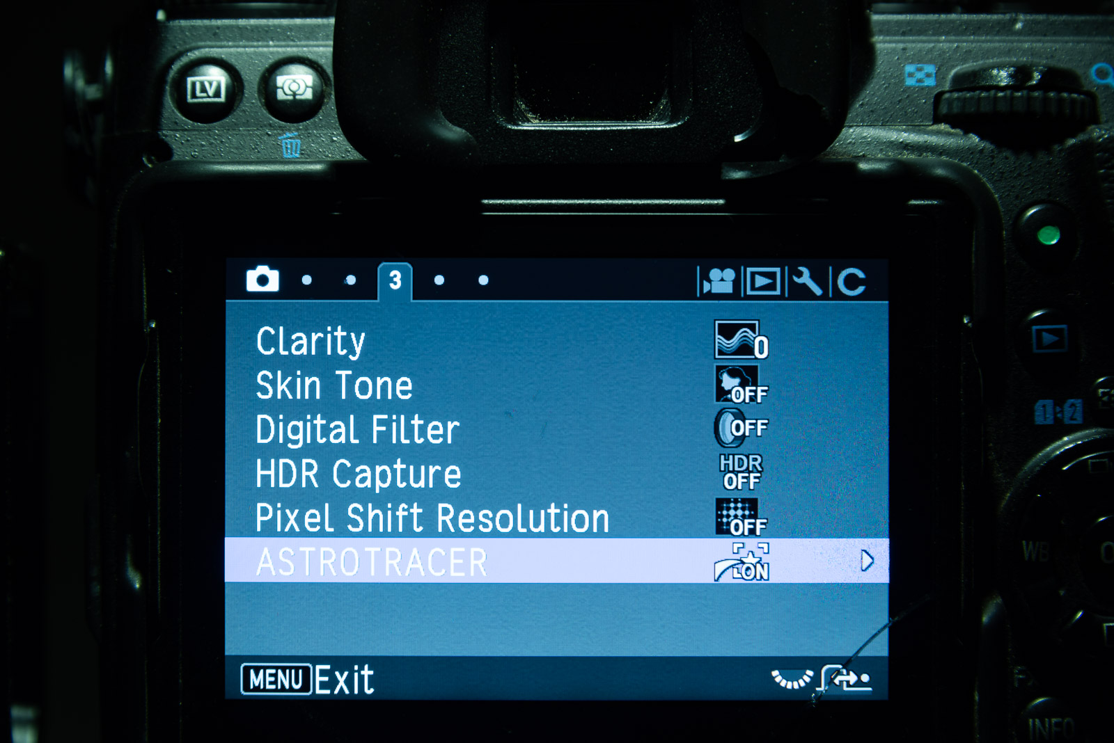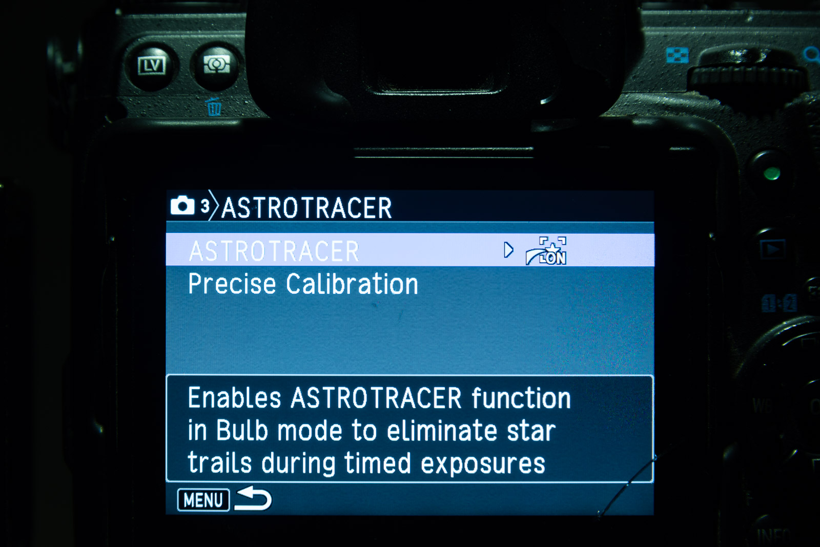 Activate it in by pressing the Menu button and proceeding to Camera 3 > Astrotracer as shown above.