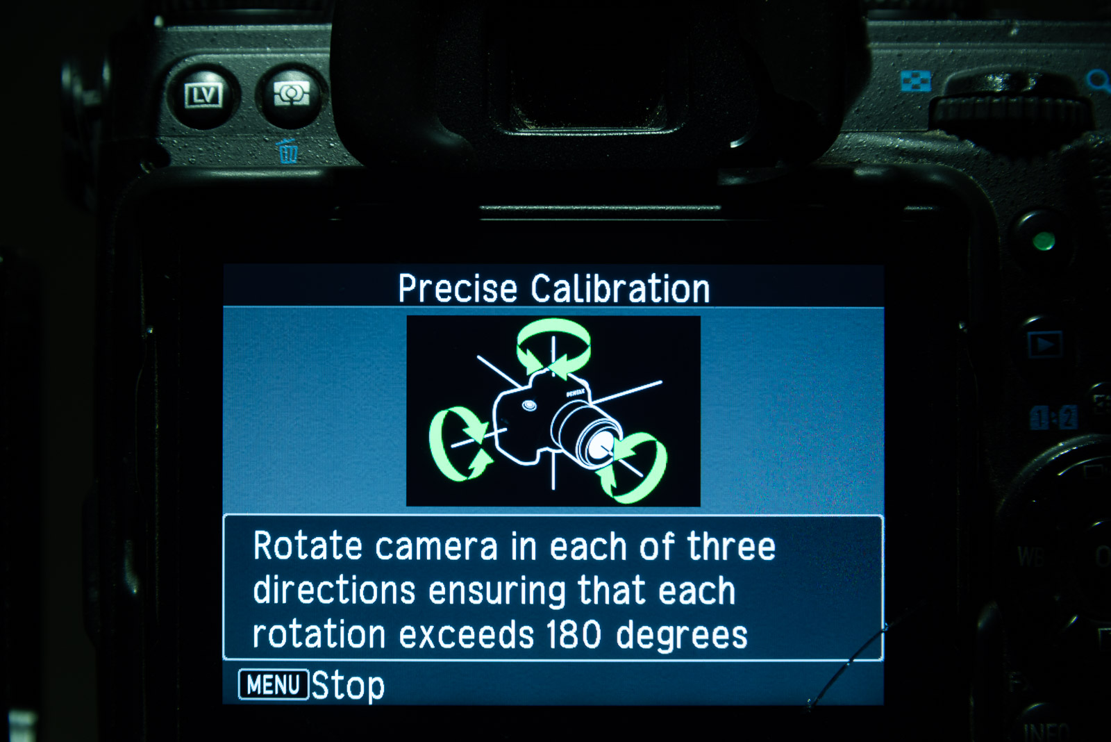 The K-1 will walk you through what to do next via on-screen instructions. It will tell you to rotate your camera on three different axes at least 180 degrees. This requires you to do a fun and easy “spin dance.”