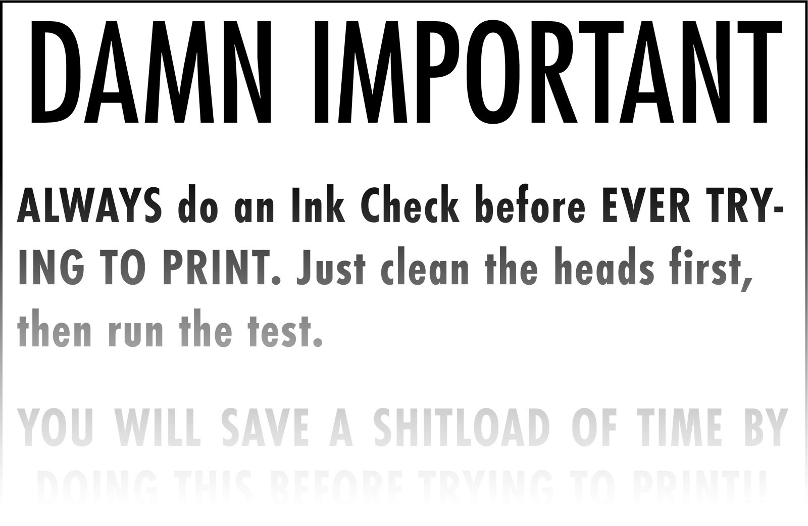 If you don’t print that often, always clean the heads first, and then print the test page. Cleaning the heads nearly always will guarantee a good print. In fact, put a sign on your printer, so you see it every time. Make sure you use strong language, so you pay attention to it. This isn’t a read me file you can skip — it’s more of a kick you in the backside type of action notice.