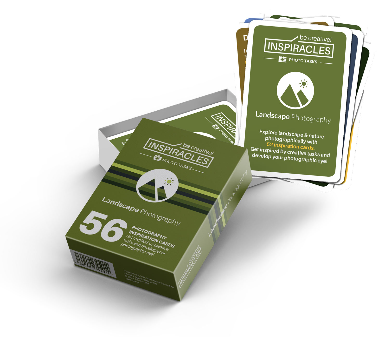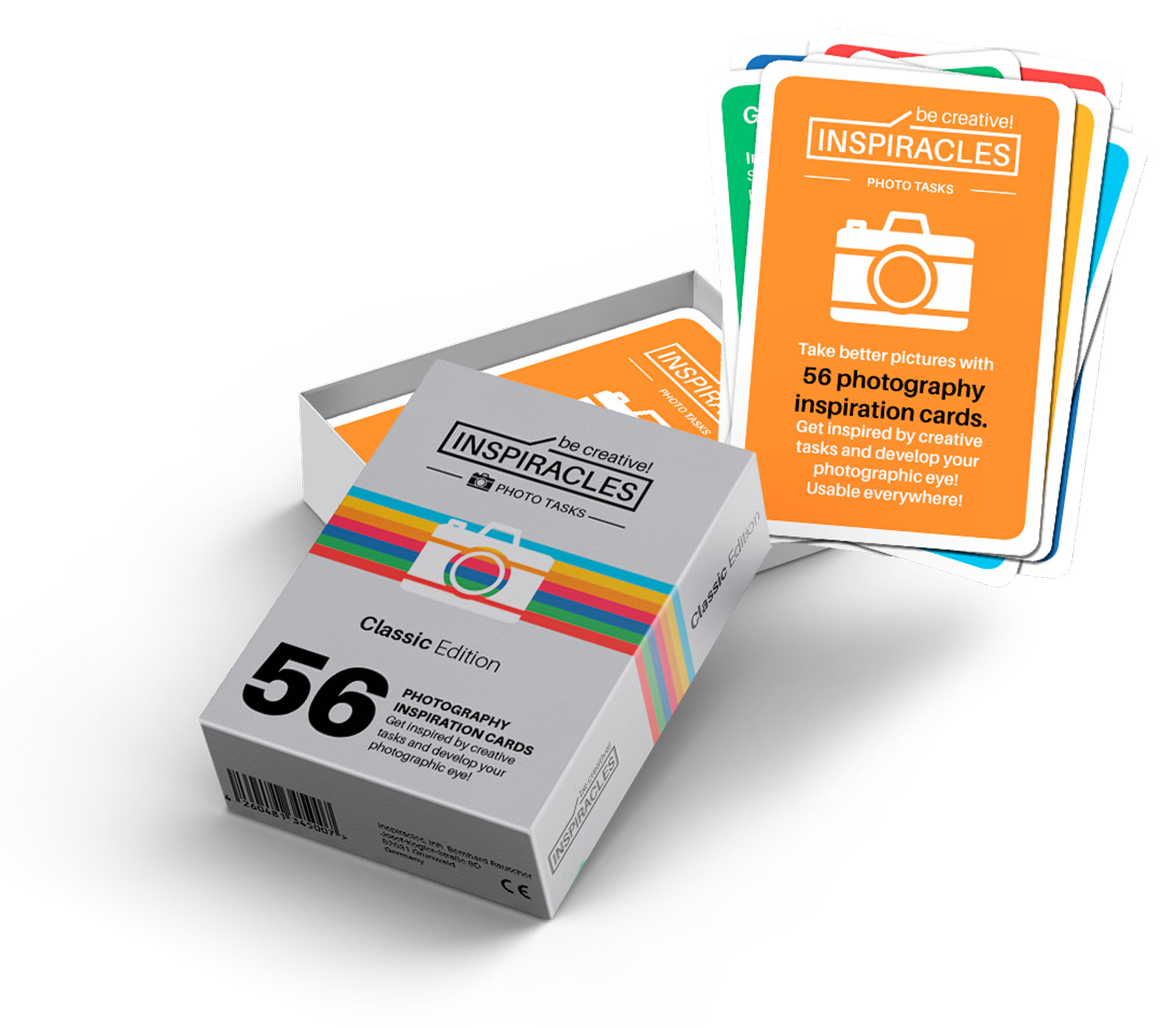 This ready-to-launch product is called Inspiracles Photography Inspiration Cards! Inspiracles are colorful card decks full of creative ideas and exercises to help you learn photography. The cards contain bite-size photo tasks that are easy to understand without needing a lengthy explanation.