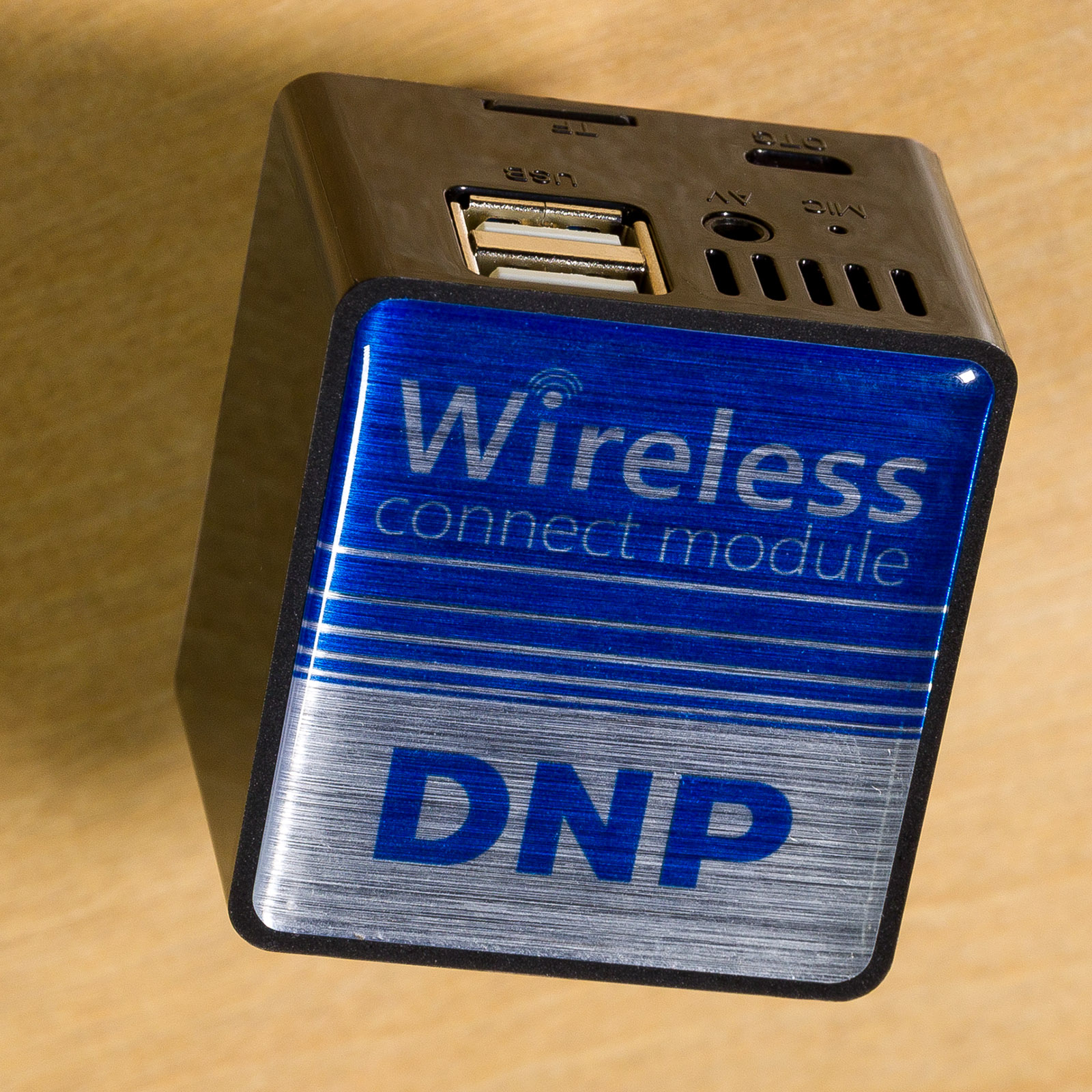 The printer uses an included USB-B cable to connect to a computer or the Wireless Connect Module (WCM). This module provides wireless connectivity for iOS and Android devices as well as for Windows and macOS computers. The included USB-A to B cable plugs into the WCM. The WCM also has an Ethernet port to connect DNP printers to hard-wired networks.