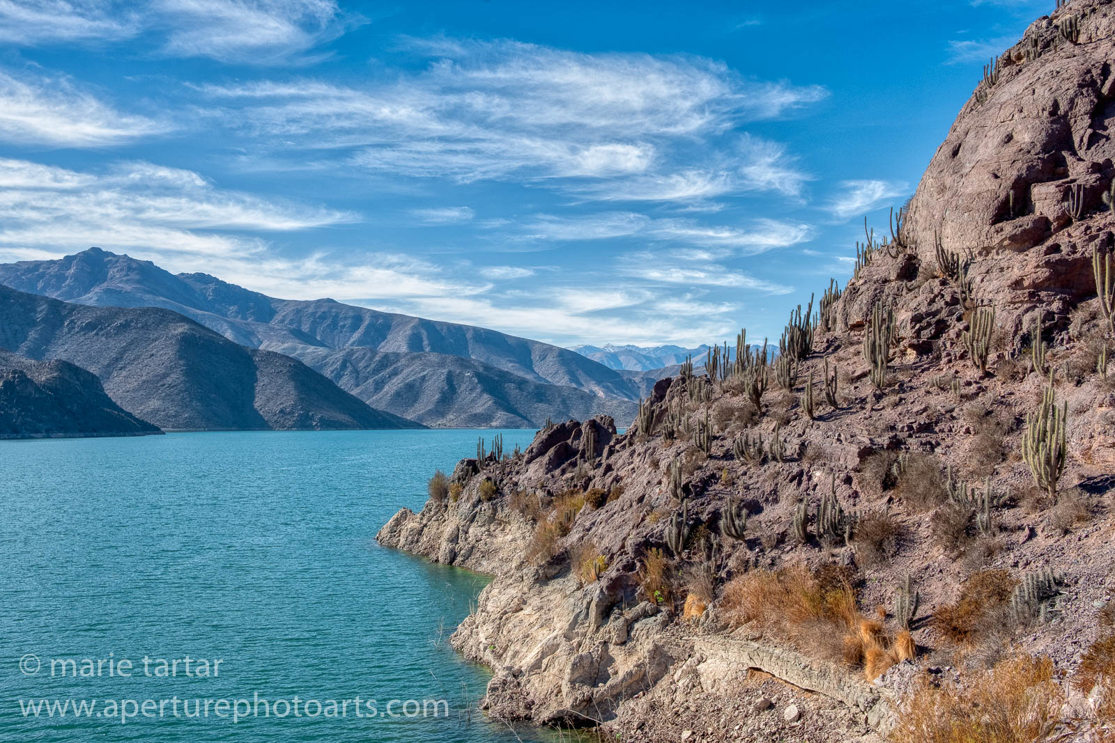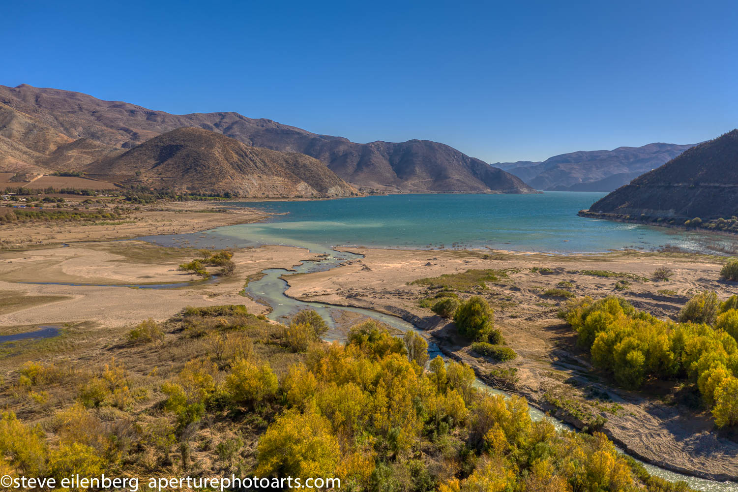 This body of water, Puclaro, is a reservoir created in 2003 to supply water to the coastal towns and support irrigation to the valley. Visually, it is a lake rimmed by hills, with Route 41 closely hugging the southern margin. So closely, in fact, that driving it, it became clear there were effectively no safe places to pull over for potential eclipse viewing and shooting.